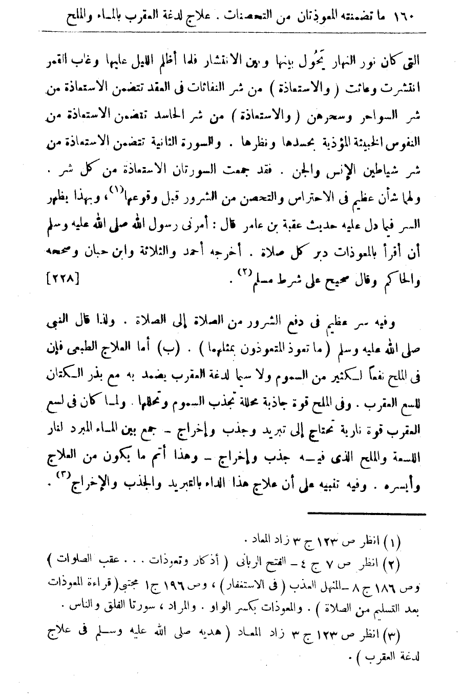 وفيه سر عظيم في دفع الشرور من الصلاة. ولذا قال النبي صلى الله عليه وسلم (ما تعوذ المتعوذون بمثلهما). (ب) أما العلاج الطبعى فإن في الملح نفعا لكثير من السموم ولا سيما لدغة العقرب يضمد به مع بذر الكتان للسع العقرب. وفى الملح قوة جاذبة محلله تجذب السموم وتحللها. ولما كان في لسع العقرب قوة نارية تحتاج إلى تبريد وجذب وإخراج - وهذا أتم ما يكون من العلاج وأيسره. وفيه تنبيه على أن علاج هذا الداء بالتبريد والجذب والأخراج (¬3).