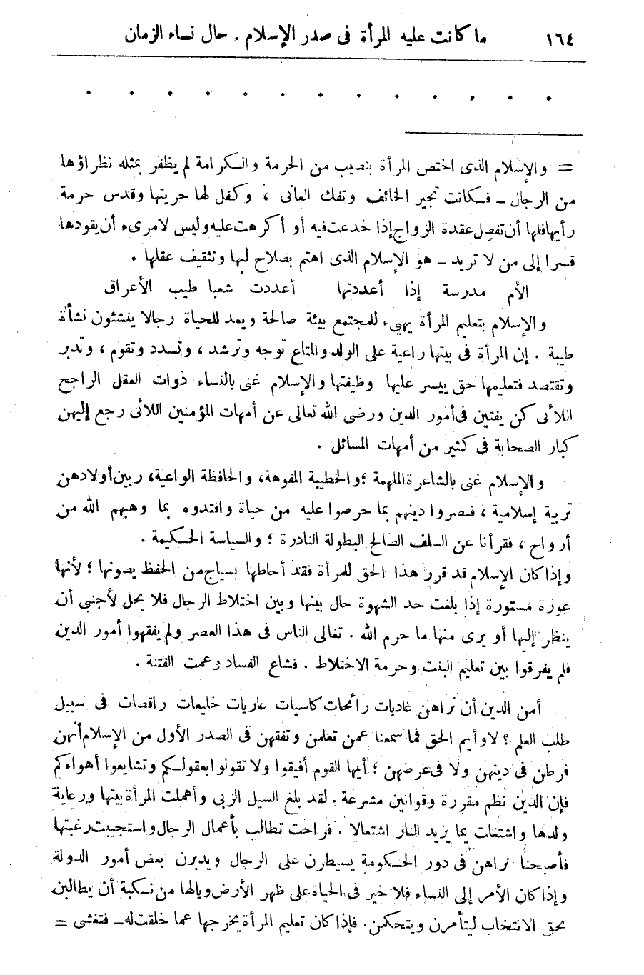 أمن الدين أن نراهن غاديات رائحات كاسيات عاريات خليعات راقصات فى سبيل طلب العلم؟ لا وايم الحق فما سمعنا عمن تعلمن وتفقهن فى الصدر الأول من الإسلام أنهن فرطن فى دينهن ولا فى عرضهن، ايها القوم افيقوا ولا تقولوا بعقولكم وتشايعوا أهواءكم فإن الدين نظم مقررة وقوانين مشرعة. لقد بلغ السيل الزبى وأهملت المرأة بيتها ورعاية ولدها واشتغلت بما يزيد النار اشتعالا. فراحت تطالب باعمال الرجال واستجيبت رغبتها فاصبحنا نراهن فى دور الحكومة يسيطرن على الرجال ويدبرن بعض أمور الدولة وإذا كان الأمر إلى النساء فلا خير فى الحياة على ظهر الرض الرض ويالها من نكبة أن يطالبن بحق الانتخاب ليتامرن ويتحكمن. فإذا كان تعليم المرأة يخرجها عما خلقت له فتغشى =