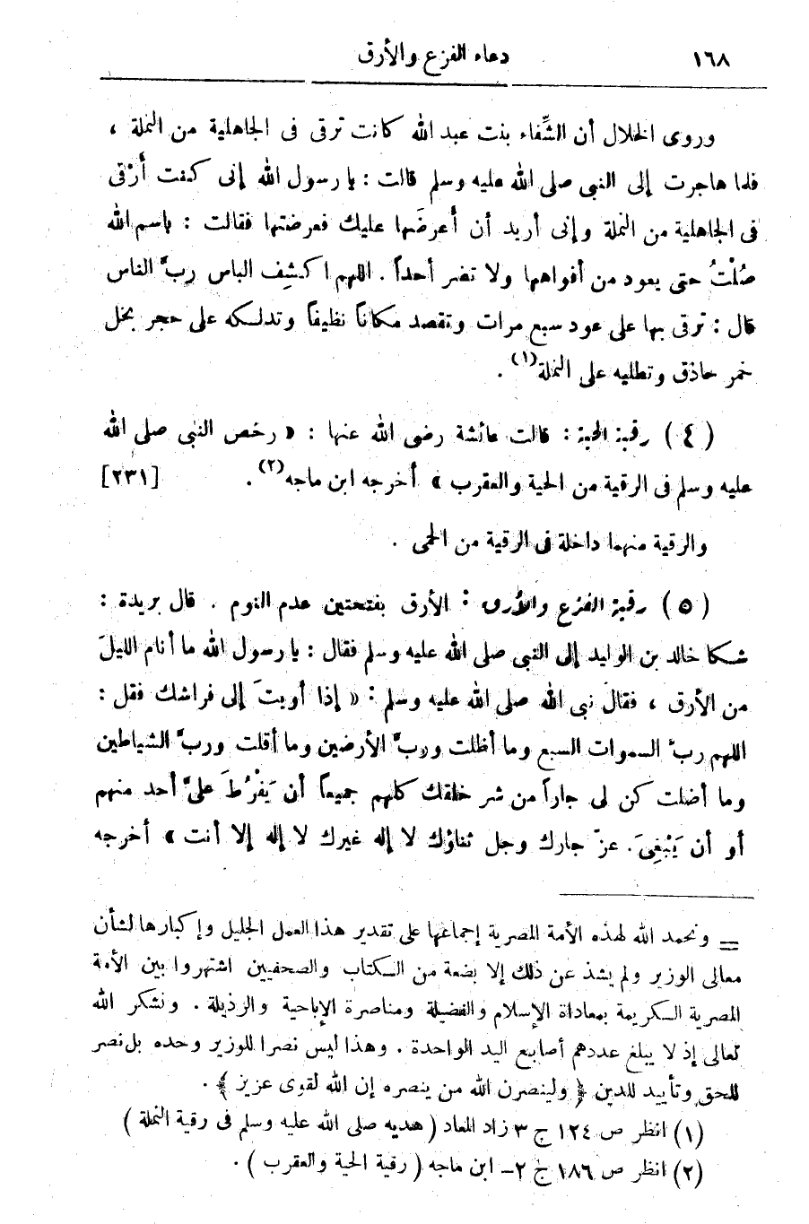 (4) رقية الحبة: قالت عائشة رضى الله عنها: رخص النبي صلى الله عليه وسلم في الرقية من الحية والعقرب " أخرجه ابن ماجه. (¬2) {231} والرقية منهما داخله في الرقية من الحمى.