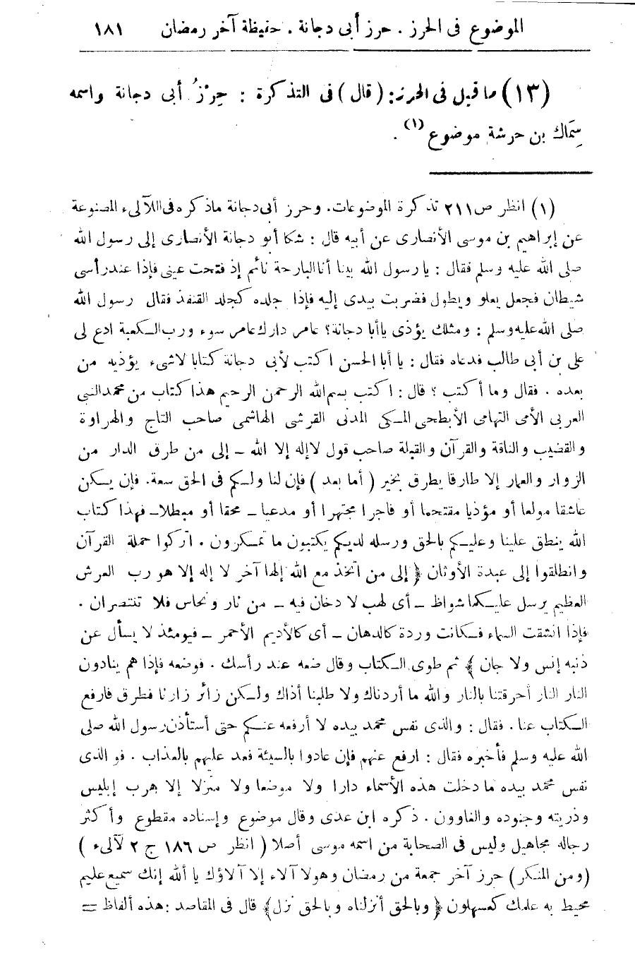 (13) ما قيل في الحرز: (قال) في التذكرة: حرز آبى دجانة واسمه سماك بن حرشة موضوع (¬1).