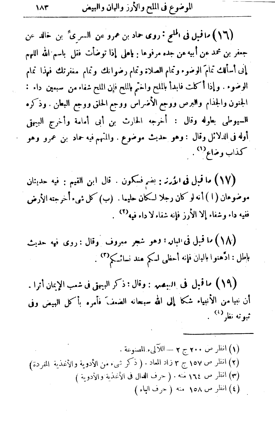 (16) ما قيل في الملح: روى حماد بن عمرو عن السرى بن خالد عن جعفر بن محمد عن أبيه عن جده مرفوعا: يا على إذا توضأت فقل باسم الله اللهم إنى أسألك تمام الوضوء وتمام الصلاة وتمام رضوانك وتمام مغفرتك فهذا تمام الوضوء. وإذا أكلت فابدأ بالملح واختم بالملح فإن الملح شفاء من سبعين داء: الجنون والجذام والبرص ووجع الأضراس ووجع الخلق ووجع البطن وذكره السيوطى بطوله وقال: أخرجه الحارث بن أبى أمامه وأخرج البيهقى أوله في الدلائل وقال: وهو حديث موضوع. والمتهم فيه جماد بن عمرو وهو كذاب وضاع (¬1).
