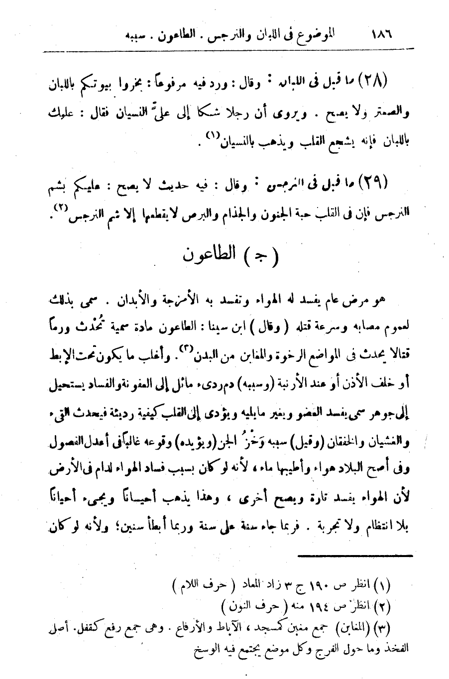 هو مرض عام يفسد له الهواء وتفسد به الأمزجة والأبدان. سمى بذلك لعموم مصابه وسرعة قتله (وقال) ابن سينا: الطاعون مادة سمية تحدث ورما قتالا يحدث في المواضع الرخوة والمغابن من البدن (¬3). وأغلب ما يكون تحت الإبط أو خلف الأذن أو عند الرنبة (وسببه) دم رديء مائل إلى العفونة والفساد يستحيل إلى جوهر سمى يفسد العضو ويغير ما يليه ويؤدى إلى القلب كيفية رديئة فيحدث القيء والغثيان والخفقان (وقيل) سببه وخز الجن (ويؤيده) وقوعه غالبا في أعدل الفصول وفى اصح البلاد هواء وأطيبها ماء، لأنه لو كان بسبب فساد الهواء لدام في الأرض لأن الهواء يفسد تارة ويصح أخرى، وهذا يذهب أحيانا ويجئ أحيانا بلا انتظام ولا تجربة. فربما جاء سنة على سنة وربما أبطأ سنين؛ لأنه لو كان