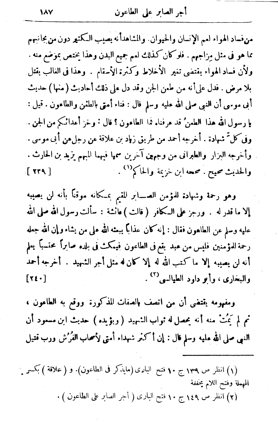 (¬2) انظر ص 149 ج 10 فتح البارى (أجر الصابر على الطاعون).