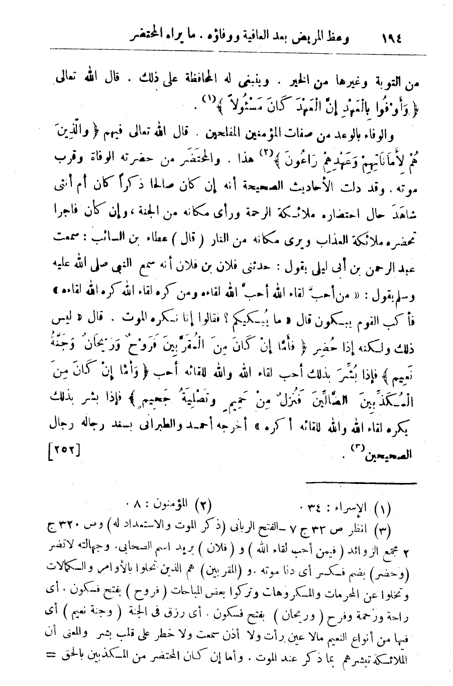 والوفاء بالوعد من صفات المؤمنين المفلحين. قال الله تعالى فيهم " وَالَّذِينَ هُمْ لِأَمَانَاتِهِمْ وَعَهْدِهِمْ رَاعُونَ " (¬2) هذا والمحتضر من حضرته الوفاة وقرب موته وقد دلت الأحاديث الصحيحة أنه كان صالحا ذكرا كان أم أنثى شاهد حال احتضاره ملائكة الرحمة ورأى مكانه من الجنة، وإن كان فاجرا تحضره ملائكة العذاب ويرى مكانه من النار (قال) عطاء بن السائب: سمعت عبد الرحمن بن آبى ليلى يقول: حدثني فلا بن فلان أنه سمع النبي صلى الله عليه وسلم يقول: " من أحب لقاء الله أحب الله لقاءه ومن كره لقاء الله كره الله لقاءه " فأكب القوم يبكون قال " ما يبكيكم؟ فقالوا إنا نكره الموت قال " ليس ذلك ولكنه إذا حضر " فأَمَّا إنْ كَانَ مِنَ الْمُقَرَّبِينَ فَرَوْحُ وَرْيحاَنُ وَجَنَّةُ نَعيِم " فإذا بشر بذلك أحب لقاء الله والله للقائه أحب " وَأمْا إنْ كَانَ مِنَ الْمُكَذَّبِينَ الضَّالَّينَ فَنُزلُ مِنْ حَمِيمِ وتَصْلِيةُ جَحِيمِ " فإذا بشر بذلك يكره لقاء الله والله للقائه أكره " أخرجه أحمد والطبرانى بسند رجاله رجال الصحيحين (¬3).