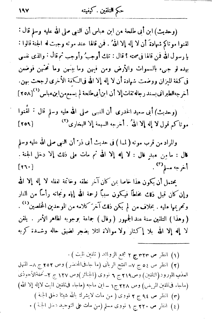 (¬2) انظر ص 54 ج 7 - الفتح الربانى (ما جاء فى المحتضر) وص 252 ج 8 - المنهل العذب المورود (التلقين) وص 219 ج 6 نووى (الجنائز) وص 127 ج 2 تحفة الآحوزى (ما جاء فى تلقين المريض 9 وص 228 ج 1 - ابن ماجه (ما جاء فى تلقين الميت لا اله الا الله)
