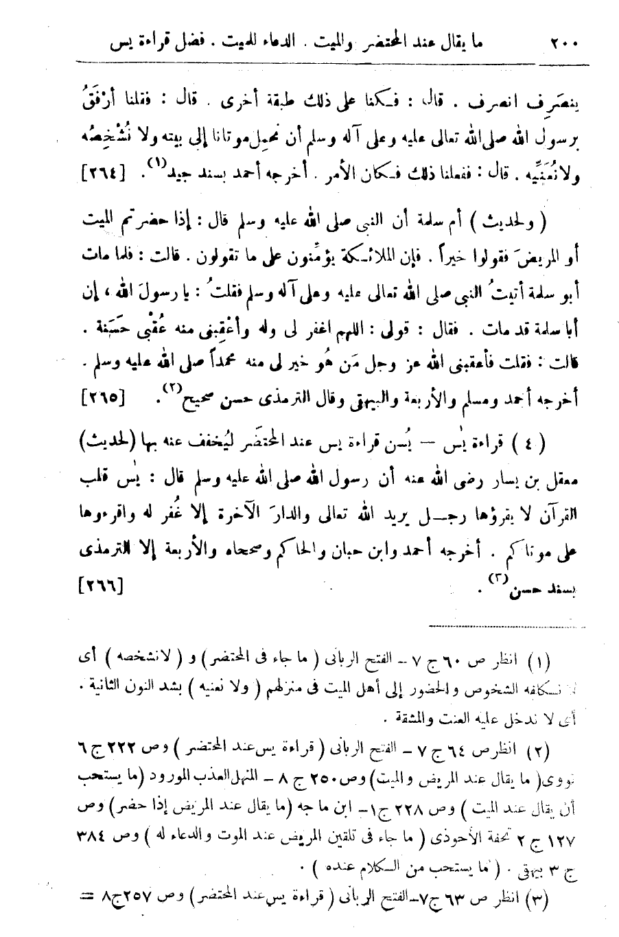 (¬2) انظر ص 64 ج 7 - الفتح الربانى (قراءة يس عند المحتضر) وص 222 ج 6 نووى (ما يقال عند المريض والميت) وص 250 ج 8 - المنهل العذب المورود (ما يستحب أن يقال عند الميت) وص 228 ج 1 - ابن ماجه (ما يقال عند المريض اذا حضر) وص 127 ج 2 تحفة الأحوذى (ما جاء فى تلقين المريض عند الموت والدعاء له) وص 384 ج 3 بيهقى (ما يستحب من الكلام عنده)