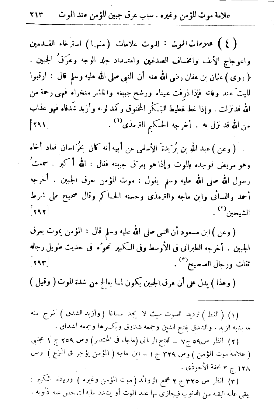 (¬2) انظر ص 59 ج 7 - الفتعح الربانى (ما جاء فى المحتضر) وص 259 ج 1 مجتبى (علامة موت المؤمن) وص 329 ج 1 - ابن ماجه (المؤمن يؤجر فى النزع) وص 128 ج 3 تحفة الأحوذى
