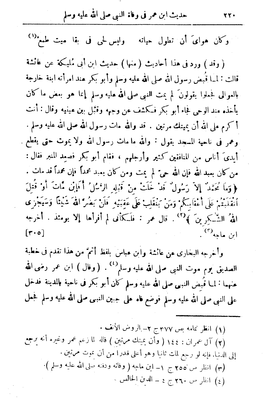 (وقد) ورد في هذا أحاديث (منها) حديث ابن أبى مليكة عن عائشة قالت: لما قبض رسول الله صلى الله عليه وسلم وأبو بكر عند أمرأته ابنة خارجة بالعوالى فجعلوا يقولون لم يمت النبي صلى الله عليه وسلم إنما هو بعض ما كان يأخذه عند الوحي فجاء أبو بكر فكشف عن وجهه وقبل بين عينيه وقال: أنت أكرم على الله أن يميتك مرتين. قد والله مات رسول الله صلى الله عليه وسلم وعمر في ناحية المسجد يقول: والله ما مات رسول الله ولا يموت حتى يقطع أيدي أناس من المنافقين كثير أرجلهم، فقام أبو بكر فصعد المنبر فقال: من كان يعبد الله فإن الله حي لم يمت ومن كان يعبد محمدا فإن محمدا قد مات " وَمَا مُحَمَّدٌ إِلاَّ رَسُولٌ قَدْ خَلَتْ مِن قَبْلِهِ الرُّسُلُ أَفَإِن مَّاتَ أَوْ قُتِلَ انقَلَبْتُمْ عَلَى أَعْقَابِكُمْ وَمَن يَنقَلِبْ عَلَىَ عَقِبَيْهِ فَلَن يَضُرَّ اللهَ شَيْئاً وَسَيَجْزِي اللهُ الشَّاكِرِينَ" (¬2) قال عمر: فكأني لم أقرأها إلا يومئذ. أخرجه ابن ماجه (¬3). {305}