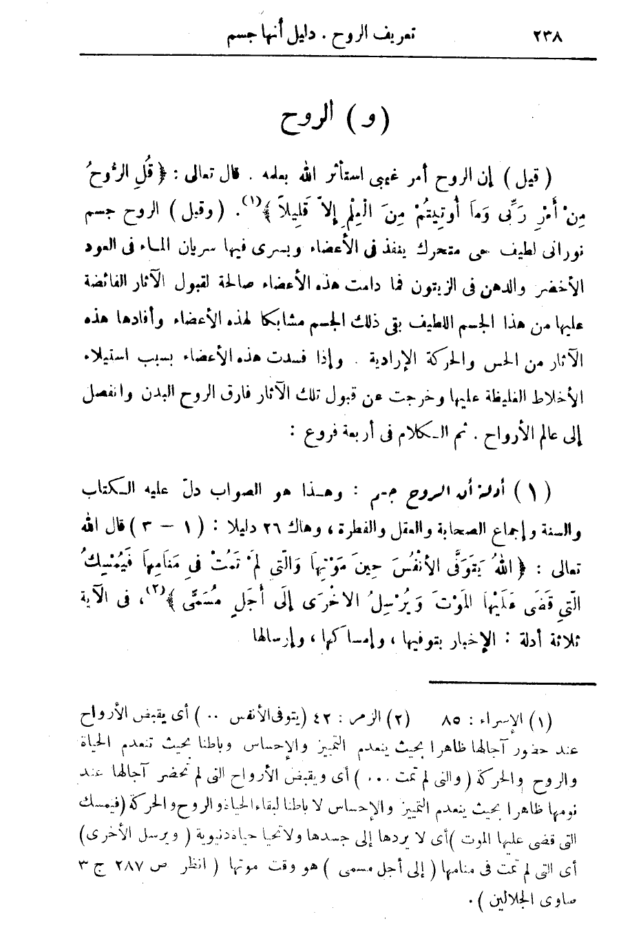 (قيل) إن الروح أمر غيبي استأثر الله بعلمه. قال تعالي " قُلِ الرُّوحُ مِنْ أَمْرِ رَبِّي وَمَا أُوتِيتُم مِّن الْعِلْمِ إِلاَّ قَلِيلاً " (¬1). (وقيل) الروح جسم نوراني لطيف تعجزوه متحرك ينفذ فكأني الأعضاء ويسرى فيها سريان الماء فكأني العود الأخضر والدهن فكأني الزيتون فما دامت هذه الأعضاء صالحة لقبول الآثار الفائضة عليها منهذا الجسم اللطيف بقى ذلك الجسم مشابكا لهذه الأعضاء أفادها هذه الآثار من الحس والحركة الإرادية. وإذا فسدت هذه الأعضاء بسبب استيلاء الأخلاط الغليظة عليها وخرجت عن قبول تلك الآثار فارق الروح البدن وانفصل إلى عالم الأرواح. ثم الكلام حي أربعة فروع: