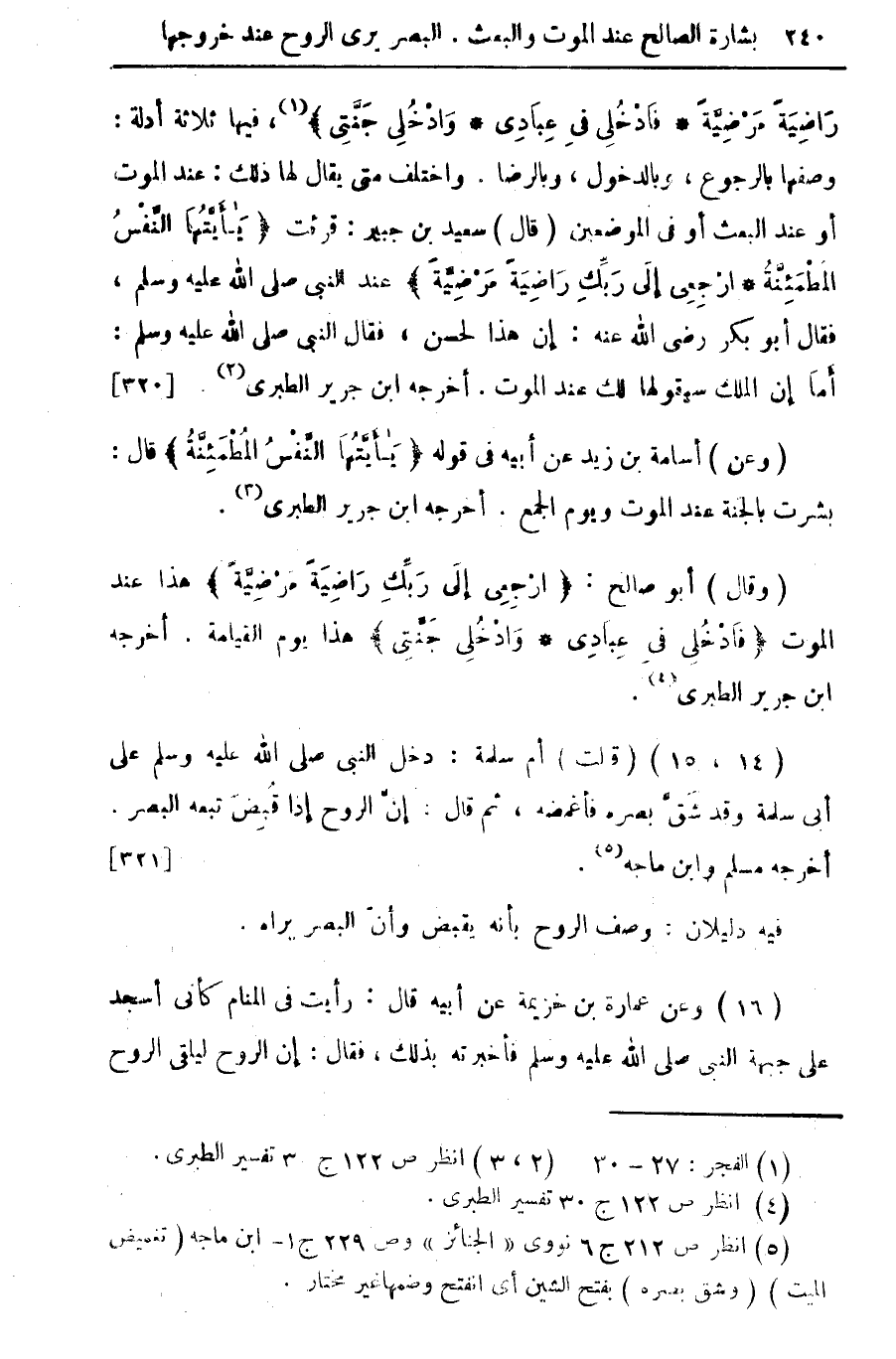 (وعن) أسامة بن زيد عن أبيه حي قوله " يَا أَيَّتُهَا النَّفْسُ الْمُطْمَئِنَّةُ " قال: بشرت بالجنة عند الموت ويوم الجمع. أخرجه ابن جرير الطبري (¬3).