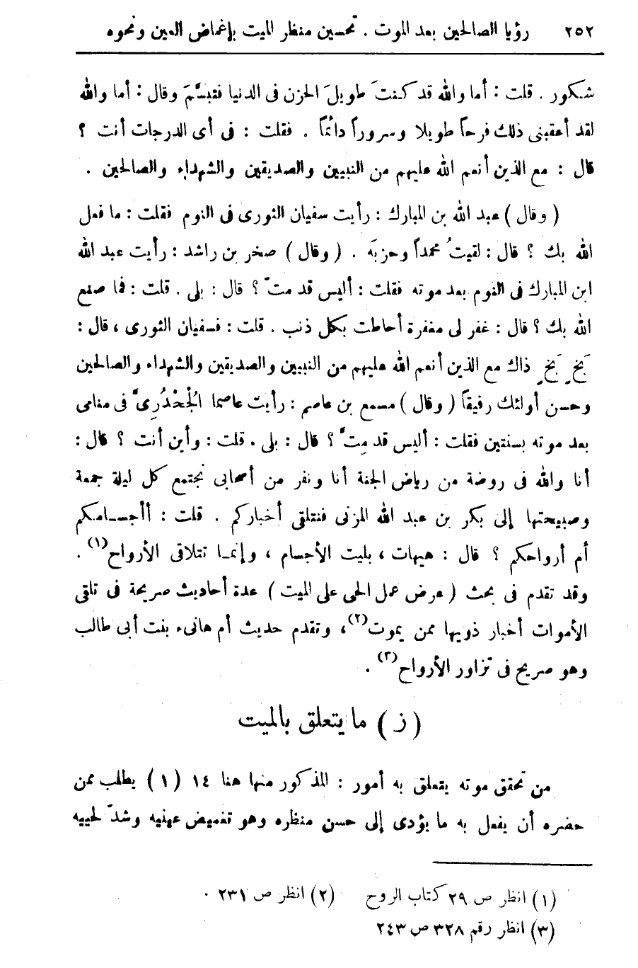(وقال) عبد الله بن المبارك: رأيت سفيان الثوري في النون فقلت: ما فعل الله بك؟ قال: لقيت محمدا وحزبه. (قال) صخر بن راشد: رأيت عبد الله ابن المبارك في النوم بعد نوته فقلت: أليس قدمت؟ قال: فسفيان الثوري، قال: بخ بخ ذاك مع الذين أنعم الله عليهم من النبيين والصديقين والشهداء والصالحين وحسن أولئك رفيقا (وقال) مسمع بن عاصم: رأيت عاصما الجحدرى في منامي بعد موته بسنتين فقلت: أليس قدمت؟ قال: بلى ز قلت: وأين أنت؟ قال: أنا والله في روضة من رياض الجنة أنا ونفر من أصحابي نجتمع كل ليلة جمعة وصبيحتها إلى بكر بن عبد اله المزني فنتلقى أخباركم. قلت: أأجسامكم أم أرواحكم؟ قال: هيهات، بليت الأجسام، وإنما تتلاقى الأرواح (¬1).