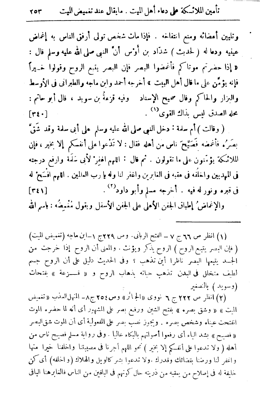 (وقالت) أم سلمة: دخل النبي صلى الله عليه وسلم على أبي سلمة وقد شق بصره فاغمضه فصيح ناس من أهله فقال: لا تدعوا على أنفسكم إلا بخير، فإن الملائكة يؤمنون على ما تقولون. ثم قال: اللهم اغفر لبى سلمة وارفع درجته في المهديين واخفله في عقبه في الغابرين واغفر لنا وله يارب العالمين. اللهم أفسح له في قبره ونور له فيه. أخرجه مسلم وأبو داود (¬2). {341}