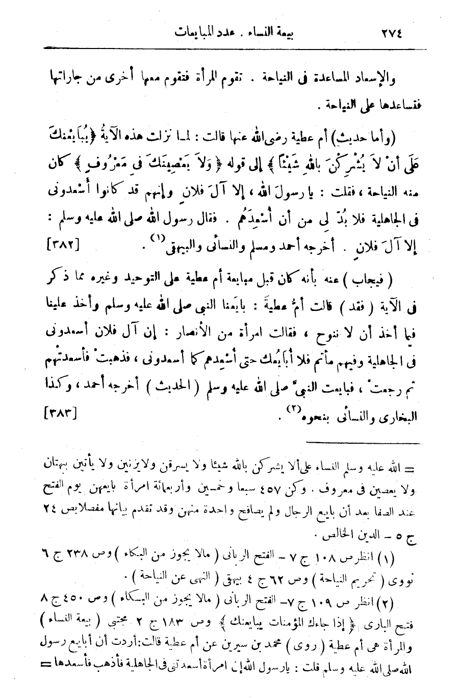 (وأما حديث) أم عطية رضى الله عنها قالت: لما نزلت هذه الآية " يُبَايعْنكَ عَلَى أنْ لاَ يُشْرِكْنَ باللِه شَيئْاَ " إلى قوله ط وَلاَ يَعْصيِنَكَ في مَعْروفِ " كان منه النياحة، فقلت: يا رسول الله، إلا آل فلان وإنهم قد كانوا أسعدوني في الجاهلية فلابد لي من أن أسعدهم. فقال رسول الله صلى الله عليه وسلم: إلا آل فلان. أخرجه أحمد ومسلم والنسائي والبيهقى (¬1). {382}