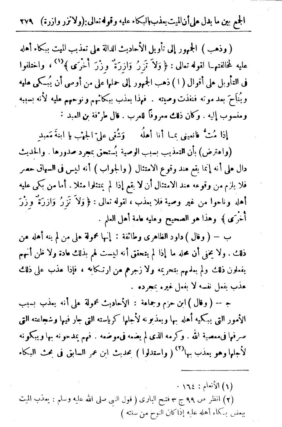 (وذهب) الجمهور إلى تأويل الأحاديث الدالة على تعذيب الميت ببكاء أهله عليه لمخالفتها لقوله تعالى: " وَلاَ تَزِرُ وَازِرَةٌ وِزْرَ أُخْرَى " (¬1)، واختلفوا في التأويل على أقوال (أ) ذهب الجمهور إلى حملها على من أوصى أن يبكى عليه ويناح بعد موته فنفذت وصيته. فهذا يعذب ببكائهم ونوحهم عليه لأنه بسببه ومنسوب إليه. وكان ذلك معروفا للعرب. قال طرفة بن العبد: