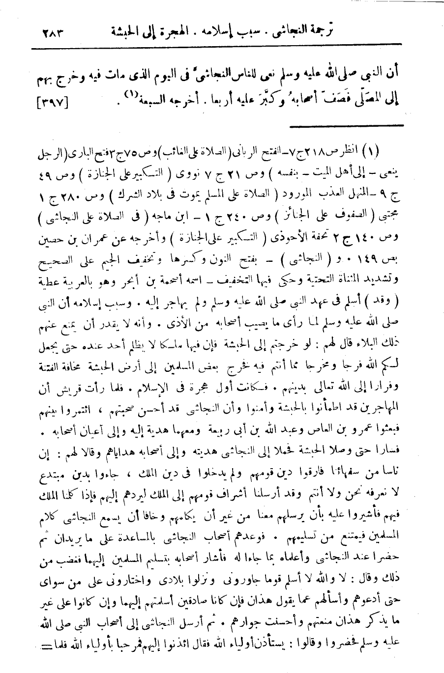 (¬1) انظر ص 218 ج 7 - الفتح الربانى (الصلاة على الغائب) وص 75 ج 3 فتح البارى (الرجل ينعى - إلى أهل الميت - بنفسه) وص 21 ج 7 نووى (التكبير على الجنازة) وص 49 ج 9 - المنهل العذب المورود (الصلاة على المسلم فى بلاد الشرك) وص 280 ج 1 مجتبى (الصفوف على الجنائز) وص 240 ج 1 - ابن ماجه (فى الصلاة على النجاشى) وص 140 ج 2 تحفة الأحوذى (التكبير على الجنازة) وأخرجه عن عمران بن حصين وتشديد المثناة التحتيه وحكى فيها التخفيف - اسمه اصحمة بن ابحر وهو بالعربية عطية (وقد) اسلم فى عهد النبى صلى الله عليه وسلم ولم يهاجر إليه. وسبب إسلامه أن النبى صلى الله عليه وسلملما رأى ما يصيب اصحابه من الأذى. وأنه لا يقدر أن يمنع عنهم ذلك البلاء قال لهم: لو خرجتم إلى الحبشة فإن فيها ملكا لا يظلم أحد عنده حتى يجعل لكم الله فرجا ومخرجا مما أنتم فيه فخرج بعض المسلمين ألى ارض الحبشة مخافة الفتنة وفرارا الى الله تعالى بدينهم. فكانت أول هجرة فى الإسلام. فلما رأت قريش أن المهاجرين قد اطمانوا بالحبشة وأ/، ,أ ,أن النجاشى قد أحسن صحبتهم، ائتمروا بينهم فبعثوا عمرو بن العاص وعبد الله بن ابى ربيعة ومعهما هدية اليه والى أعيان أصحابه .. فسارا حتى وصلا الحبشة فحملا الى النجاشى هديته والى اصحابه هداياهم وقالا لهم: إن ناسا من شفهائنا فارقوا دين قومهم ولم يدخلوا فى دين الملك، جاءوا بدبن مبتدع لا نعرفه نحن ولا أنتم وقد ارسلنا اشراف قومهم الى الملك ليردهم إليهم فإذا كلمنا الملك فيهم فأشيروا عليه بأن يرسلهم معنا من غير أن يكلمهم وخافا أن يسمع النجاشى كلام المسلمين فيمتنع من تسليمهم. فوعدهم أصحاب النجاشى بالمساعدة علىما يريدان ثم حضرا عند النجاشى وأعلماه بما جاءا له فاشار اصحابه بتسليم المسلمين اليهما فغضب من ذلك وقال: لا والله لا اسلم قوما جاوزونى ونزلوا بلادى واختارونى على من سواى حتى أدعوهم واسالهم عما يقول هذان فإن كانا صادقين أسلمتهم اليهما وإن كانوا على غير ما يذكر هذان منعتهم وأحسنت جوارهم. ثم ارسل النجاشى الى اصحاب البى صلى الله عليه وسلم فحضروا وقالوا: يستأذن أولياء الله فقال ائذنوا اليهم فمرحبا بأولياء الله فلما =