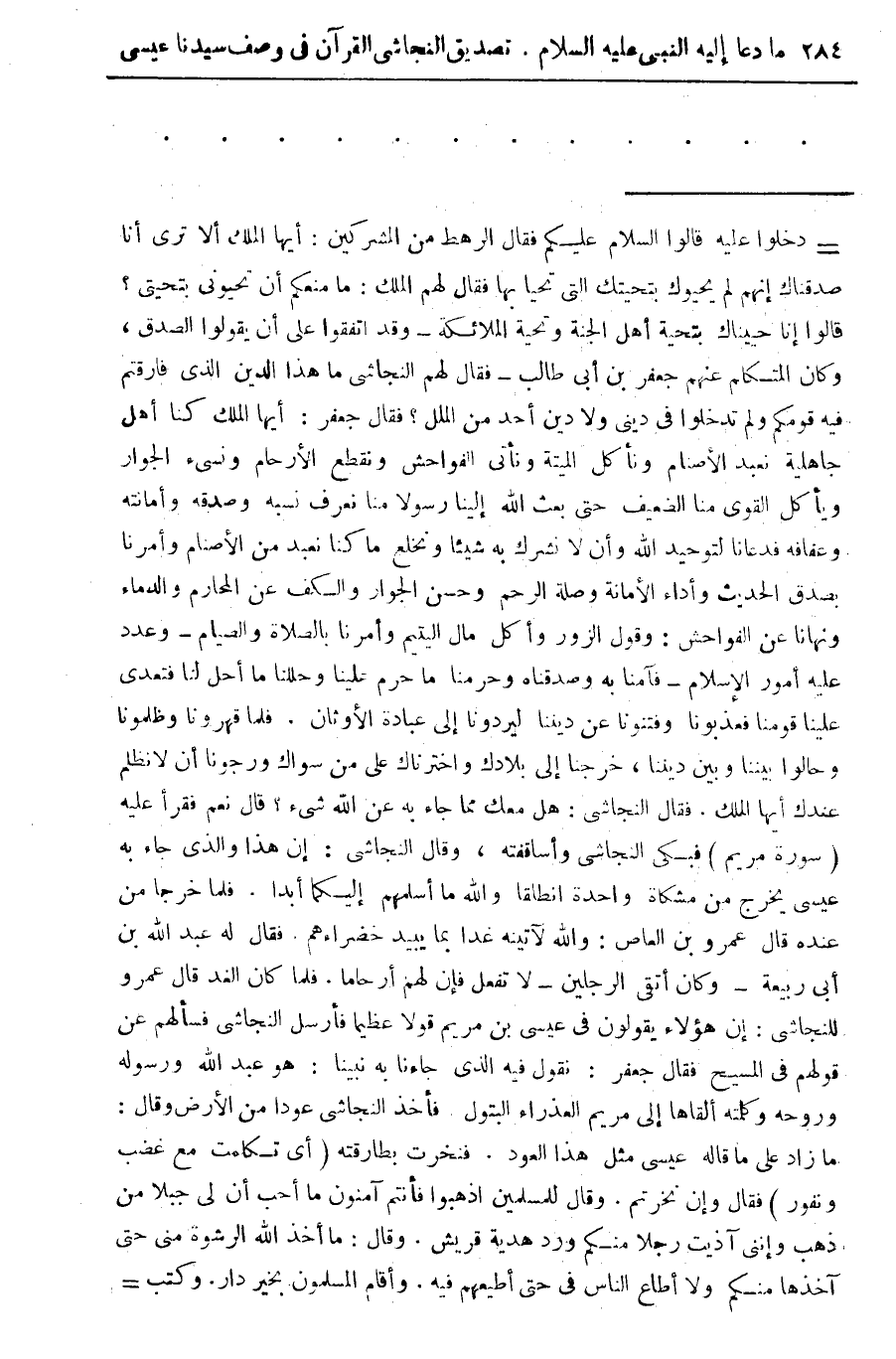= دخلوا عليه قالوا السلام عليكم فقال الرهط من المشركين: ايها الملك ألا ترى أنا صدقناك إنهم لم يحبوك بتحيتك التى تحيا بها فقال لهم الملك: ما منعكم أن تحيونى بتحيتى؟ قالوا إنا حييناك بتحية أهل الجنة وتحية الملائكة - وقد اتفقوا على أن يقولوا الصدق، وكان المتكلم عنهم جعفر بن ابى طالب - فقال لهم النجاشى ما هذا الدين الذى فارقتم فيه قومكم ولم تدخلوا فى دينى ولا دين أحد من الملل؟ فقال جعفر: ايها الملك كنا أهل جاهلية نعبد الأصنام ونأكل الميتة ونأتى الفواحش ونقطع الأرحام ونسئ الجوار وياكل القوى منا الضعيف حتى بعث الله الينا رسولا منا نعرف نسبه وصدقه وأمانته بصدق فدعانا لتوحيد الله وأن لا نشرك به شيئا ونخلع ما كنا نعبد من الأصنام وأمرنا بصدق الحديث وأداء الأمانة وصلة الرحم وحسن الجوار والكف عن المحارم والدماء ونهانا عن الفواحش: وقول الزور وأكل مال اليتيم وأمرنا بالصلاة والصيام - وعدد عليه أمور الإسلام - فآمنا به وصدقناه وحرمنا ما حرم علينا وحللنا ما أحل لنا فتعدى علينا قومنا فعذبونا وفتنونا عن ديننا ليردونا إلى عبادة الأوثان. فلما قهرونا وظلمونا وحالوا بيننا وبين ديننا، خرجنا إلى بلادك واخترناك على من سواك ورجونا أن لا نظلم عندك أيها الملك. فقال النجاشى: هل معك مما جاء به عن الله شئ؟ قال نعم فقرأ عليه (سورة مريم) فبكى النجاشى واسافقته، وقال النجاشى: إن هذا والذى جاء به عيسى يخرج من مشكاة واحدة انظلقا والله ما أسلمهم إليكما أبدا. فلما خرجا من عنده قال عمرو بن العاص: والله لآتينه غدا بما يبيد خضراءهم فقال له عبد الله بن ابى ربيهة - وكان أتقى الرجلين - لا تفعل فإن لهم أرحاما. فلما كان الغد قال غمرو للنجاشى: إن هؤلاء يقولون فى عيسى بن مريم قولا عظيما فارسل النجاشى فسالهم عن قولهم فى المسيح فقال جعفر: نقول فيه الذى جاءنا به نبينا: هو عبد الله ورسوله وروحه وكلمته القاها الى مريم العذراء البتول فأخذ النجاشى عودا من الأرض وقال: ما زاد على ما قاله عيسى مثل هذا العود. فنخرت بطارقته (أى تكلمت مع غضب ونفور) فقال وإن نخرتم. وقال للمسلمين اذهبوا فأنتم آمنون ما أحب أن لى جبلا من ذهب وإننى آذنت رجلا منكم ورد هدية قريش. وقال /اأخذ الله الرشوة منى حتى آخذها منكم ولا أطاع الناس فى حتى أطيعهم فيه. وأقام المسلمون بخير دار. وكتب =