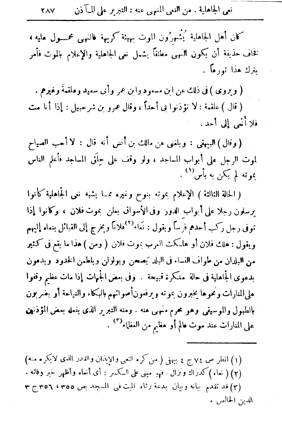 (الحالة الثالثة) الإعلام بموته بنوح وغيره مما يشبه نعى الجاهلية كانوا يرسلون رجلا على أبواب الدور وفى الأسواق يعلن بموت فلان، وكانوا إذا توفى رجل ركب أحدهم فرسا ويقول: نعاء (¬2) فلانا ويخرج إلى القبائل بنعاه إليهم ويقول: هلك فلان أو هلكت العرب بموت فلان (ومن) هذا ما يقع برئ كثير من البلدان من طواف النساء برئ البلد يصحن ويولولن ويلطمن الخدود ويدعون بدعوى الجاهلية برئ حالة منكرة قبيحة. وفى بعض الجهات إذا مات عظيم وقفوا على المنارات ونحوها يخبرون بموته ويرفعون أصواتهم بالبكاء والنياحة أو يضربون بالطبول والموسيقى وهو محرم منهي عنه. ومنه التبرير البخاري يفعله بعض المؤذين على المنارات عند موت عالم أو عظيم من العظماء (¬3).