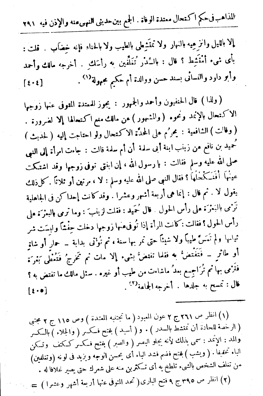 (¬1) " وأما " حديث اسماء بنت عميس زوج جعفر فقال: لا تحدى بعد يومك هذا .. أخرجه أحمد وابن حبان بسند قوى وصححاه (انظر ص 150 ج 7 - الفتح الربانى - الإحداد على الميت. وص 393 ج 9 فتح البارى) " فظاهره " أنه لا يجب الإحداد على المتوفى عنها زوجها بعد اليوم الثالث بل ظاهر النهى أن الإحداد لا يجوز. (والجواب) أنه حديث شاذ مخالف للأحاديث الصحيحة، وقد أجمعوا على خلافة ويدل على الوجوب أيضا حديث زينب ابنه أبى سلمة الآتي رقم 405.