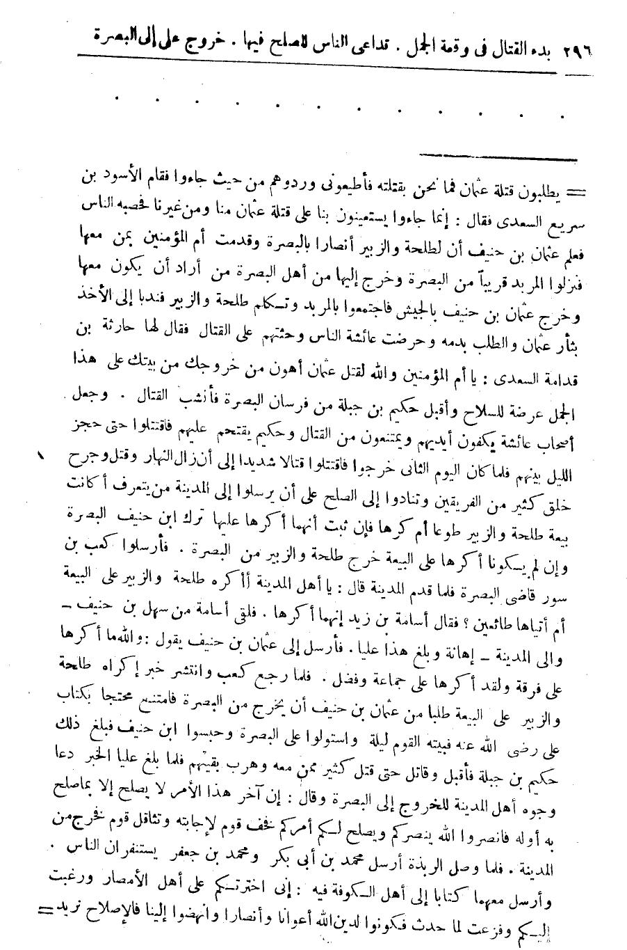 = يطلبون قتله عثمان فأطيعوني وردوهم من حيث جاءوا فقام الأسود بن سريع السعدى فقال: إنما جاءوا يستعينوا بنا على قتله عثمان منا ومن غيرنا فحصبة الناس فعلم عثمان بن حنيف أن لطلحة والزبير أنصارا بالبصرة وقدمت ام المؤمنين بمن معها غفنزلوا المربد قريبا من البصرة وخرج إليها من أهل البصرة من أراد أن يكون معها وخرج عثمان بن حنيف بالجيش فاجتمعوا بالمربد وتكلم طلحة والزبير فندبا إلى الأخذ بثار عثمان والطلب بدمه وحرضت عائشة الناس وحثهم على القتال فقال لها حارثة بن قدامه السعدى: يا أم المؤمنين والله لقتل عثمان أهون من خروجك من بيتك على هذا الجمل عرضة للسلاح واقبل حكيم بن جبلة من فرسان البصرة فانشب القتال. وجعل أصحاب عائشة يكفون أيديهم ويمتنعون من القتال وحكيم يقتحم عليهم فاقتتلوا حتى حجز الليل بينهم فأما كان اليوم الثاني خرجوا فاقتتلوا قتالا شديدا إلى أن زال النهار وقتل وجرح خلق كثير من الفريقين وتنادوا إلى الصلح على أن يرسلوا إلى المدينة من يتعرف أكانت بيعة طلحة والزبير طوعا أم كرها فإن ثبت انهما اكرها عليها ترك ابن حنيف البصرة وإن لم يكونا اكرها على البيعة خرج طلحة والزبير من البصرة. فأرسلوا كعب بن سور قاضى البصره فاما قدم المدينة قال: يا أهل المدينة أأكره طلحه والزبير على البيعة أم أتياها طائعين؟ فقال اسامة بن زيد إنهما اكرها. فلقى أسامة من سهل بن حنيف-والى المدينة - إهانة وبلغ هذا عليا. فأرسل إلى عثمان بن حنيف يقول: والله ما اكرها على فرقة ولقد اكرها على جماعة وفضل. فاما رجع كعب وانتشر خبر إكراه طلحة والزبير على البيعة طلبا من عثمان بن حنيف أن يخرج من البصرة فامتنع محتجا بكتاب على رضى الله عنه فبيته القوم ليلة واستولوا على البصرة فامتنع محتجا بكتاب على رضى الله عنه فبيته القوم ليلة واستولوا على البصرة وحبسوا ابن حنيف فبلغ ذلك حكيم أهل المدينة للخروج الى البصرة وقال: إن آخر هذا الأمر لا يصلح إلا بما صلح به أوله فانصروا الله ينصركم ويصلح لكم امركم فخف قوم لاجابته وتثاقل قوم فخرج من المدينة. فاما وصل الربذة أرسل محمد بن أبى بكر ومحمد بن جعفر يستفران الناس. وأرسل معهما كتابا إلى أهل الكوفة فيه: أني اخترتكم على أهل الأمصار ورغبت إليكم وفزعت لما حدث فكونوا لدين الله أعوانا وأنصارا وانهضوا إلينا فالإصلاح تريد =