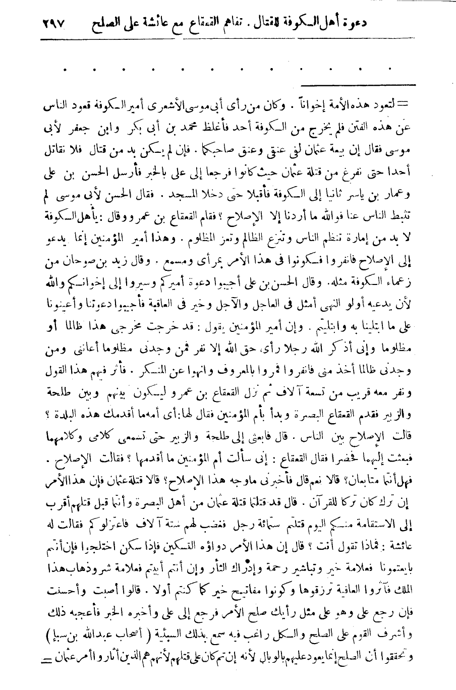 = لتعود هذه الأمة إخوانا. وكان مت رأى أبى موسى الاشعرى أمير الكوفة قعود الناس عن هذه الفتن فلم يخرج من الكوفه أحد فاغلظ محمد بن أبى بكر وابن جعفر لأبى موسى فقال إن بيعة عثمان لفي عنقي وعنق صاحبكما. فإن لم يكن بد من قتال فلا نقاتل أحدا حتى نفرغ من قتلة عثمان حيث كانوا فرجعا إلى على بالخبر فأرسل الحسن بن على وعمار بن ياسر ثانيا الى الكوفة فاقبلا حتى دخلا المسجد. فقال الحسن لأبى موسى لم تثبط الناس عنا فو الله ما أردنا الا الإصلاح؟ فقام القعقاع بن عمرو وقال: يأهل الكوفة لا بد من إمارة تنظم الناس وتنزع الظالم وتعز المظلوم. وهذا أمير المؤمنين إنما يدعو إلى الإصلاح فانفروا فكونوا في هذا الأمر بمراى ومسمع. وقال ريد بن صوحان من زعماء الكوفة مثله. وقال الحسن على أجيبوا دعوة أميركم وسيروا إلى إخوانكم والله لان يدعيه أولو النهى امثل في العاجل والأجل وخير في العاقبة فأجيبوا دعوتنا وأعينونا على ما ابتلينا به وابتليتم. وان أمير المؤمنين يقول: قد خرجت مخرجي هذا ظالما او مظلوما وإني اذكر الله رجلا رأى حق الله الا نفر فمن وجدني مظلوما أعانني ومن وجدني ظالما اخذ منى فانفروا فمروا بالمعروف وانهوا عن المنكر. فاثر فيهم هذا القول ونفر معه قريب من تسعة الاف ثم نزل القعقاع بن عمرو ليكون بينهم وبين طلحة والزبير فقدم القعقاع البصرة وبدا بام المؤمنين فقال لها: أي أمة ما أقدمك هذه البلدة؟ قالت الإصلاح بين الناس. قال فابعثي إلى طلحة والزبير حتى تسمعي كلامي وكلامهما فبعثت إليهما فحضروا فقال القعقاع: إنى سالت أم المؤمنين ما اقدمها؟ فقالت الإصلاح فهل أنتما متابعان؟ قالا نعم قال فأخبرني ماوجه هذا الإصلاح؟ قالا قتله عثمان فان هذا الأمر إن ترك تركا للقران. قال قد قتلتما قتلة عثمان من أهل البصرة وأنتما قبل قتلهم اقرب إلى الاستقامة منكم اليوم قتلتم سمائة رجل فغضب لهم سته آلاف فاعتزلوكم فقالت له عائشة: فماذا تقول أنت؟ قال إن هذا الأمر دواؤه التسكين فإذا سكن اختلجوا فان انتم بايعتمونا فعلامة خير وتباشر رحمة وإدراك الثأر وإن انتم أبيتم فعلامة شرو ذهاب هذا الملك فاثروا العافية ترزقوها وكونوا مفاتيح خير كما كنتم أولا. قالوا أصبت واحسنت فإن رجع على وهو على مثل رأيك صلح الأمر فرجع إلى على واخبره الخبر فأعجبه ذلك واشرف القوم على الصلح والكل راغب فيه سمع بذلك السبيه (أصحاب عبد الله بن سبإ) وتحققوا أن الصلح إنما يعود عليهم بالوبال لانه إن تم كان على قتلهم لانهم هم الذين أثار واامر عثمان =