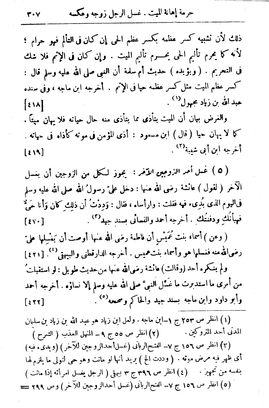 ذلك لان تشبيه كسر عظم الحي إن كان في التألم فهو حرام، لانه كما يحرم تاليم الحي يحرم تاليم الميت. وإن كان في الإثم فلا شك في التحريم. (ويؤيده) حديث أم سامة امرأة النبي صلى الله عليه وسلم قال: كسر عظم الميت مثل كسر عظمة حيا في الإثم. أخرجه ابن ماجه. وفي سنده عبد الله بن زياد مجهول. (¬1) {418}