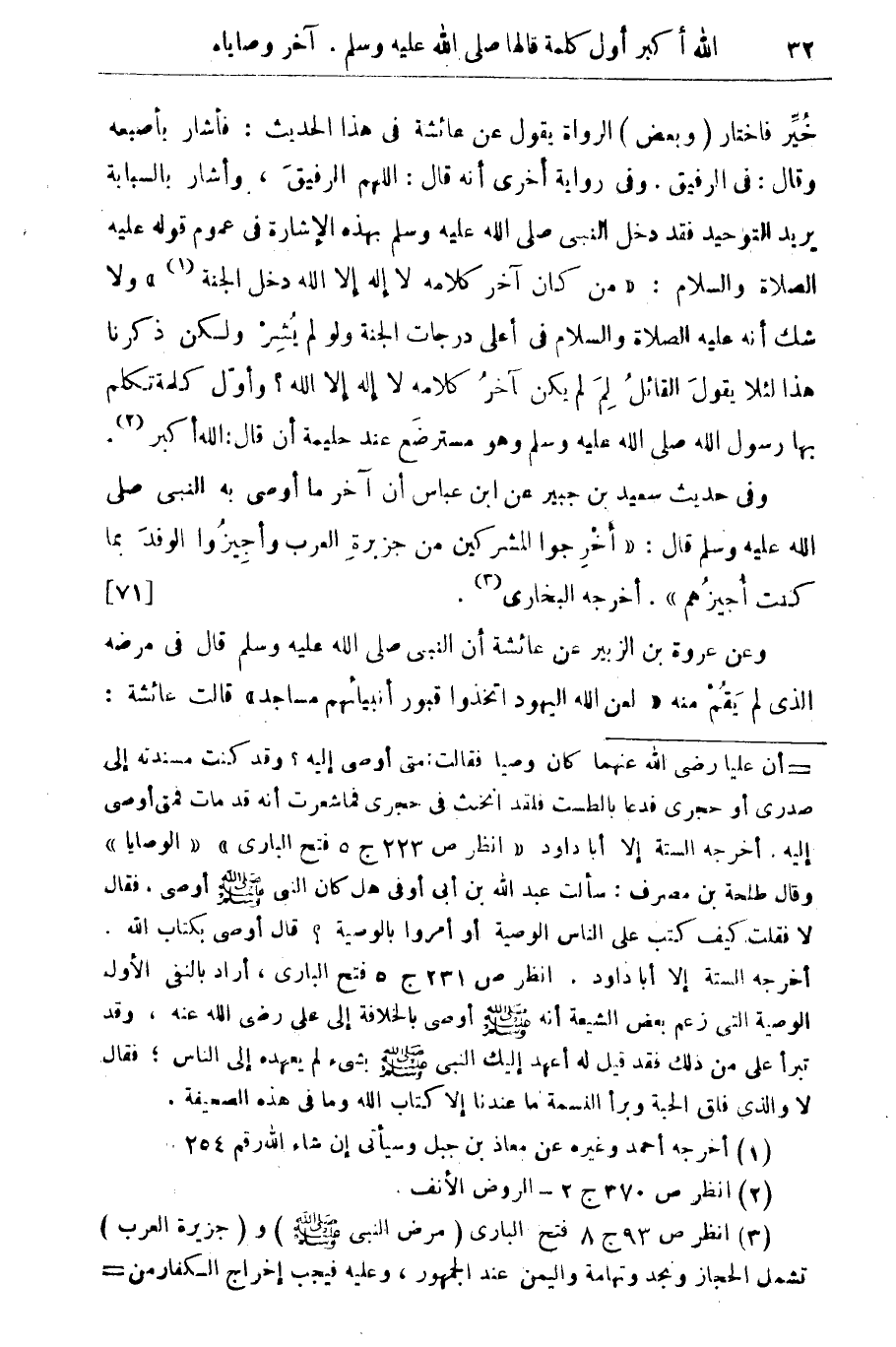 وفى حديث سعيد بن جبير عن ابن عباس أن آخر ما أوصى به النبي صلى الله عليه وسلم قال: " اخرجوا المشركين من جزيرة العرب وأجيروا الوفد بما كنت أجيزهم ". أخرجه البخاري (¬3). {71}