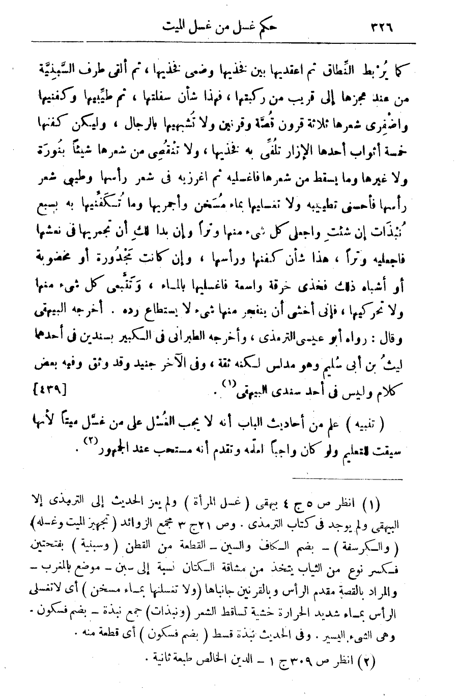 بالرجال، وليكن كفنها خمسة أثواب أحدها الإزار تلفى به فخذيها، ولا تنقصي من شعرها شيئا بنورة ولا غيرها وما يسقط من شعرها شيئا بنورة ولا غيرها وما يسقط من شعرها فاغسليه ثم اغرزيه في شعر رأسها وطيبي شعر رأسها فأحسني تطيبه ولا تغسليها بماء مسخن وأجمريها وما تكفنيها به بسبع نبذات إن شئت واجعلي كل شئ منها وترا وإن كانت مجدورة أو مخضوبة أو أشياء ذلك فخذى خرقة واسعة فاغسليها بالماء، وتنبعي كل شئ منها ولا تحركيها، فأنى أخشى أمه ينفجر منها شئ لا يستطاع ورده. أخرجه البيهقى وقال: رواه أبو عيسى الترمذى، وأخرجه الطبرانى في الكبير بسندين في أحدهما ليث بن أبى سليم وهو مداس لكنه ثقة، وفى الأخر جنيد وقد وثق وفيه بعض كلام وليس في أحد سندى البيهقى (¬1) {439}
