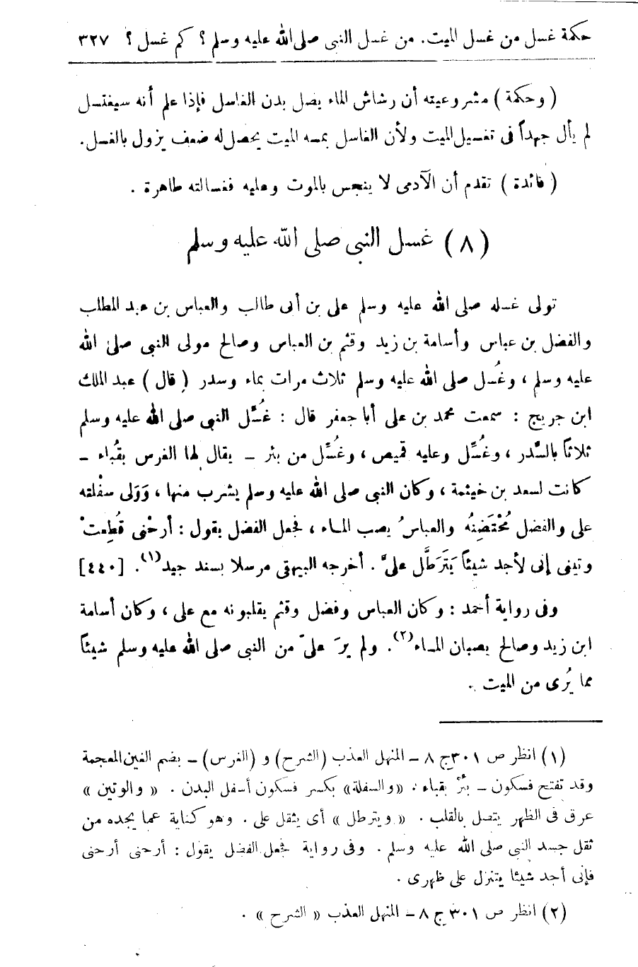 تولى غسله صلى الله عليه وسلم على بن أبى طالب والعباس بن عبد المطلب والفضل بن عباس وأسامة بن زيد وقئم بن العباس وصالح مولى المنهي صلى الله عليه وسلم، وغسل صلى الله عليه وسلم ثلاث مرات بماء وسدر (قال) عبد الملك ابن جريج: سمعت محمد بن على أبا جعفر قال: غسل المنهي صلى الله عليه وسلم ثلاثا بالمسدر، وغسل وعليه قميص، وغسل من بئر - يقال لها الغرس بقباء - كانت لسعد بن خيثمة، وكان المنهي صلى الله عليه وسلم يشرب منها، وولى سفلته على والفضل محتضنه والعباس يصب الماء، فجعل الفضل يقول: أرحني قطعت ويتنى إني لاجد شيئا يترطل على. أخرجه البيهقى مرسلا بسند جيد (¬1). {440}