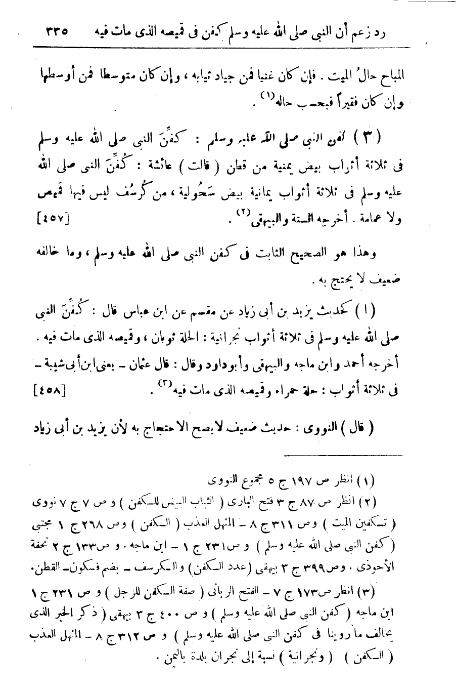(1) كحديث يزيد بن أبى زياد عن مقسم عن ابن عباس قال: كفن النبي صلى الله عليه وسلم في ثلاثة أثواب نجرانية: الحلة ثوبان، وقميصه الحي مات فيه أخرجه احمد وابن ماجة والبيهقى وأبو داود وقال: قال عثمان - يعنى ابن أبى شبية - في ثلاثة أثواب: حلة حمراء وقميصه الحي مات فيه. (¬3) {458}