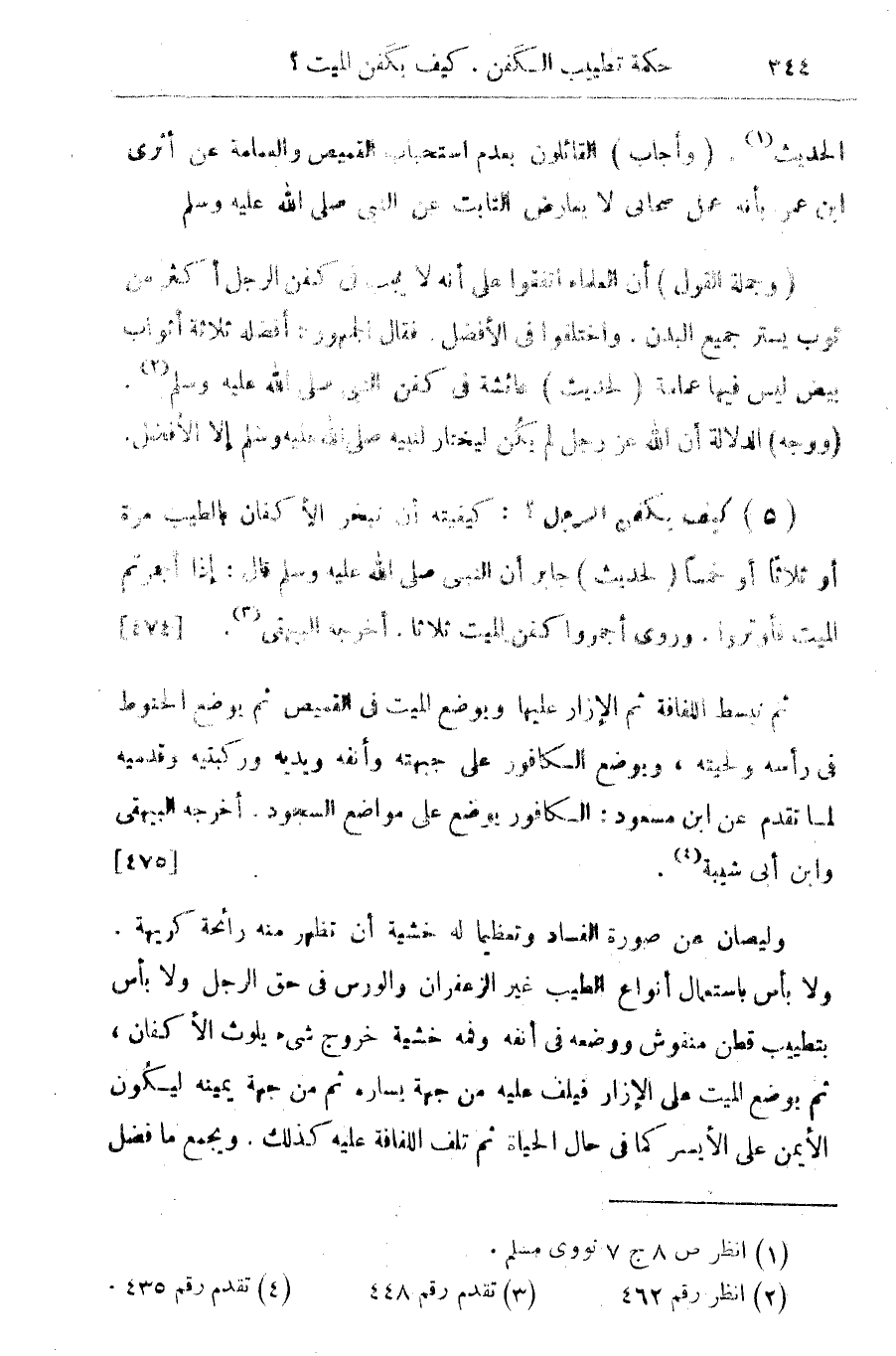 (5) كيف يكفن الرجل؟ كيفيته أن تبخر الأكفان بالطيب مرة أو ثلاثا أو خمسا (لحديث) جابر أن النبي صلى الله عليه وسلم قال: إذا أجمرتم الميت فأوتروا. وروى أجمروا كفن الميت ثلاثا. أخرجه البيهقى (¬3). {474}