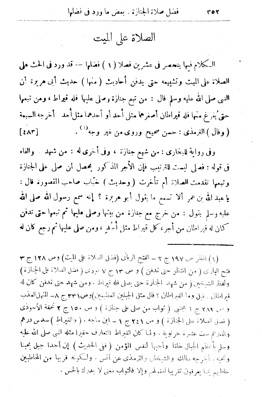 الكلام فيها ينحصر في عشرين فصلا (1) فضلها - قد ورد في الحث على الصلاة على الميت وتشييعه حتى يدفن أحاديث (منها) حديث أبي هريرة أن النبي صلى الله عليه وسلم قال: من تبع جنازة وصلى عليها فله قيراط ومن تبعها حتى يفرغ منها فله قيراطان أصغرهما مثل أحد أو أحدهما مثل أحد أخرجه السبعة (وقال) الترمذى: حسن صحيح وروى من غير وجه (¬1). {483}