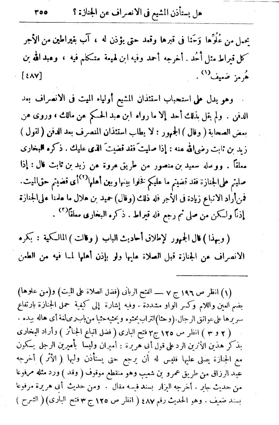 (¬3) انظر ص 125 ج 3 فتح البارى (فضل ابتاع الجنائز) واراد البخارى بذكر هذين الثرين الرد على قول ابى هريرة: أميران وليسا بأميرين الرجل يكون مع الجنازة يصلى عليها فليس له أن يرجع حتى يستأذن وليها (الثر) اخرجه عبد الرازق من طريق عمرو بن شعيب وهو منقطع موقوف (وقد) ورد مثله مرفوعا من حديث جابر. أخرجه البزار بسند فيه مقال. ومن حديث ابى هريرة مرفوعا بسند ضعيف. وهو الحديث رقم 487 (انظر ص 125 ج 3 فتح البارى) (الشرح)