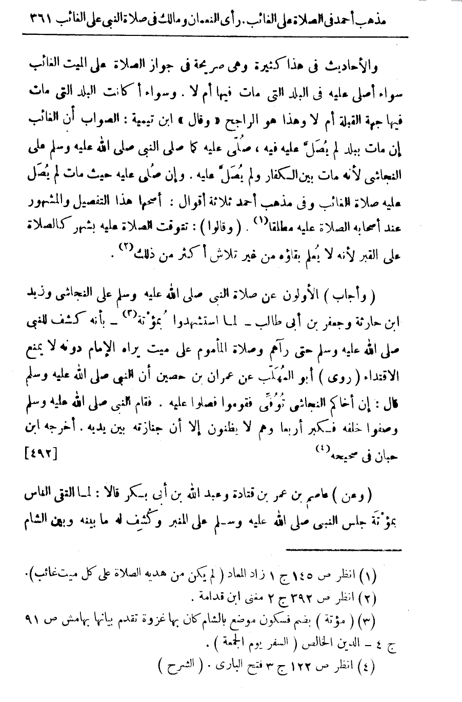 (وأجاب) الأولون عن صلاة النبي صلى الله عليه وسلم على النجاشي وزيد ابن حارثة وجعفر بن أبي طالب - لما استشهدوا بمؤتة (¬3) - بأنه كشف للنبي صلى الله عليه وسلم حتى رآهم وصلاة المأموم على ميت يراه الإمام دونه لا يمنع الاقتداء (روى) أبو المهلب عن عمران بن حصين أن النبي صلى الله عليه وسلم قال: إن أخاكم النجاشي توفى فقوموا فصلوا عليه. فقام النبي صلى الله عليه وسلم وصفوا خلفه فكبر أربعا وهم لا يظنون إلا أن جنازته بين يديه. أخرجه ابن حبان في صحيحه (¬4). {492}