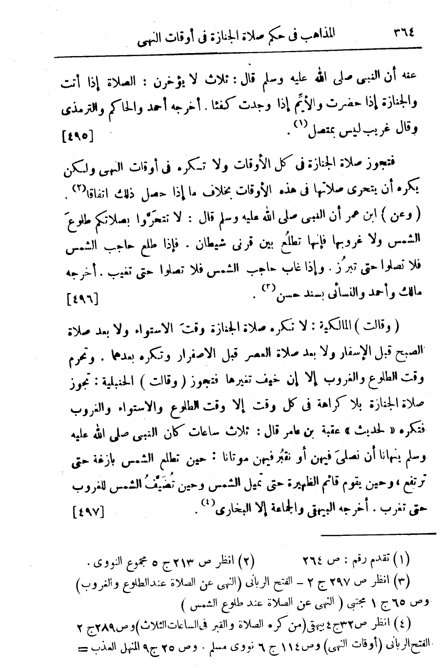 فتجوز صلاة الجنازة في كل الأوقات ولا تكره في أوقات النهى ولكن يكره أن يتحرى صلاتها في هذه الأوقات بخلاف ما إذا حصل ذلك اتفاقا (¬2). (وعن) ابن عمر أن النبي صلى الله عليه وسلم قال: لا تتحروا بصلاتكم طلوع الشمس ولا غروبها فإنها تطلع بين قرني شيطان. فإذا طلع حاجب الشمس فلا تصلوا حتى تبرز. وإذا غاب حاجب الشمس فلا تصلوا حتى تغيب. أخرجه مالك وأحمد والنسائي بسند حسن (¬3). {496}