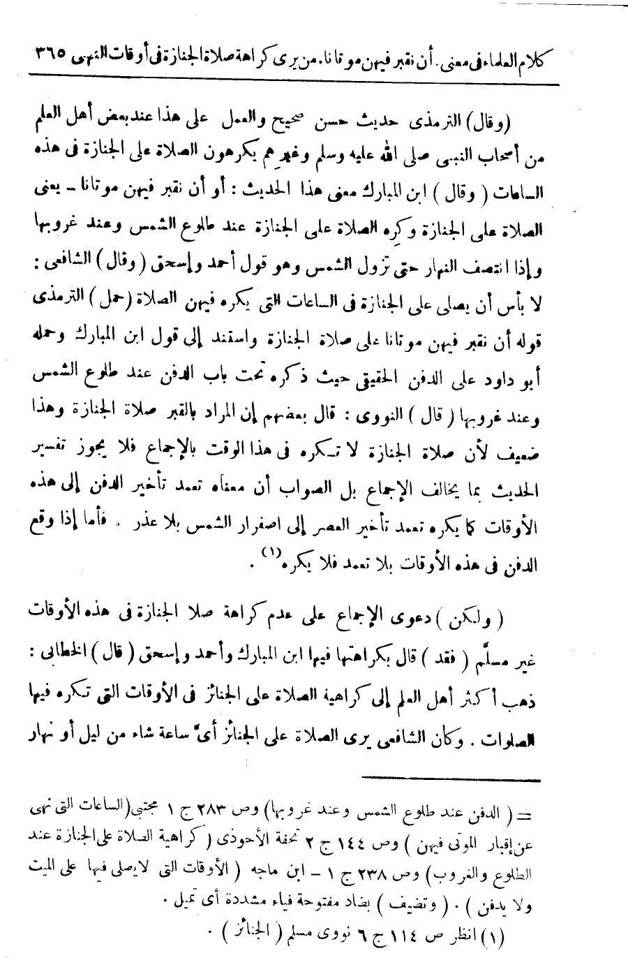 (وقال) الترمذى حديث حسن صحيح والعمل على هذا عند بعض أهل العلم من أصحاب النبي صلى الله عليه وسلم وغيرهم يكرهون الصلاة على الجنازة في هذه الساعات (وقال) ابن المبارك معنى هذا الحديث: أو أن نقبر موتانا - يعنى الصلاة على الجنازة وكره الصلاة على الجنازة عند طلوع الشمس وعند غروبها وإذا انتصف النهار حتى تزول الشمس وهو قول أحمد واسحق (وقال) الشافعي: لا باس أن يصلى على الجنازة في الساعات التي يكره فيهن الصلاة (حمل) الترمذى قوله أن نقبر فيهن موتانا على صلاة الجنازة واستند إلى قول ابن المبارك وحمله أبو داود على الدفن الحقيقي حيث ذكره تحت باب الدفن عند طلوع الشمس وعند غروبها (قال) النووي: قال بعضهم إن المراد بالقبر صلاة الجنازة وهذا ضعيف لأن صلاة الجنازة لا تكره في هذا الوقت بالإجماع فلا يجوز تفسير الحديث بما يخالف الإجماع بل الصواب أن معناه تعمد تأخير الدفن إلى هذه الأوقات كما يكره تعمد تأخير العصر إلى اصفرار الشمس بلا عذر. فأما إذا وقع الدفن في هذه الأوقات بلا تعمد فلا يكره (¬1).