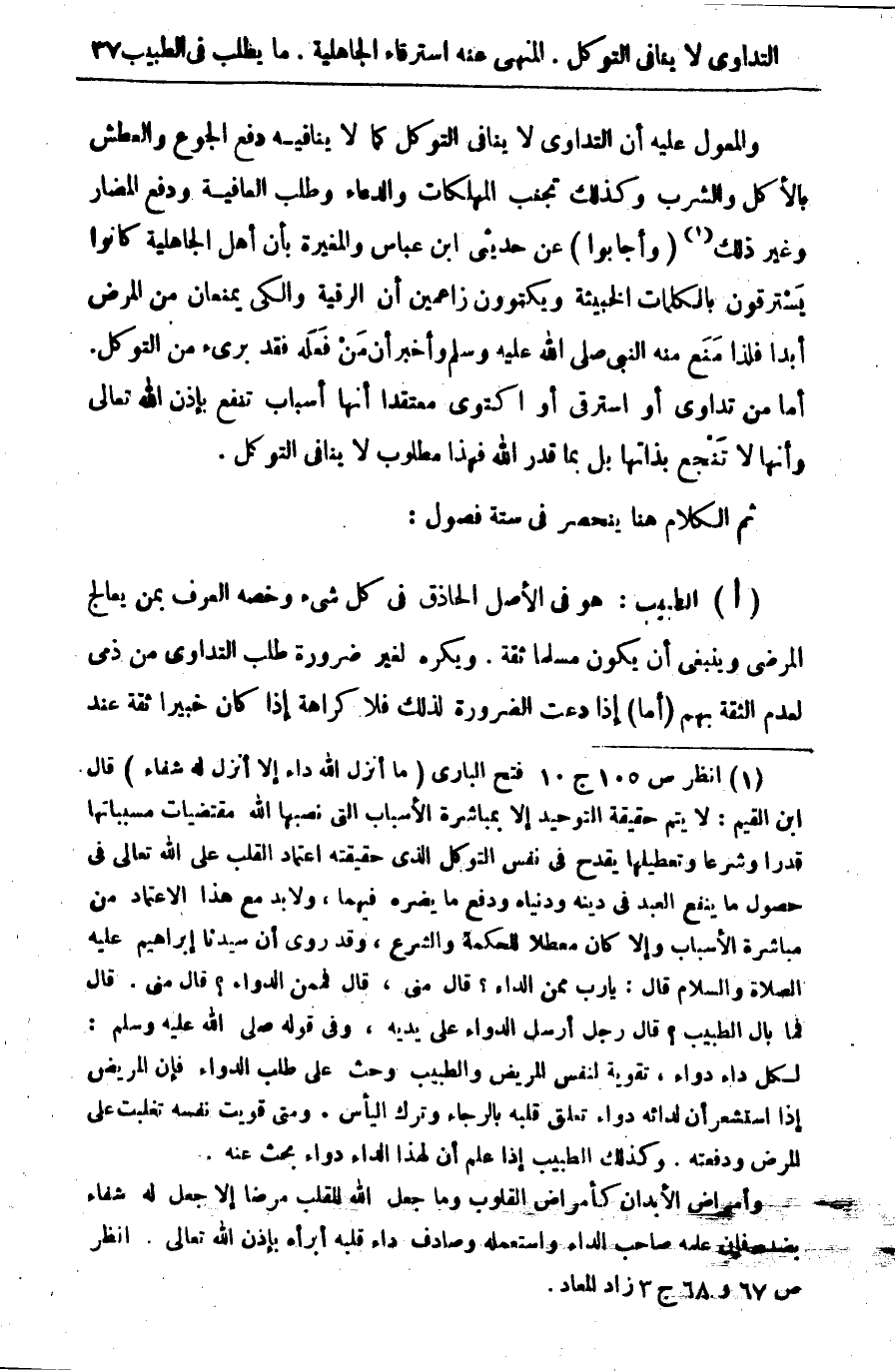 والمعول عليه أن التداوي لا ينافى التوكل كما لا ينافيه دفع الجوع والعطش بالأكل والشرب وكذلك تجنب المهلكات والدعاء وطلب العافية ودفع المضار وغير ذلك (¬1)