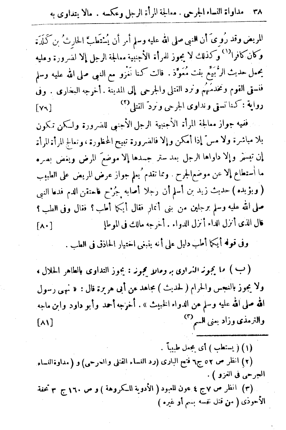 المريض وقد روى أن النبي صلى الله عليه وسلم أمر أن يستطب الحارث بن كلدة وكان كافرا (¬1) وكذلك لا يجوز للمرأة الأجنبية معالجة الرجل إلا لضرورة وعليه يحمل حديث الربيع بنت معوذ. قالت كنا نغزو مع النبي صلى الله عليه وسلم فنسقى القوم ونخدمهم ونرد القتلى والجرحى إلي المدينة. أخرجه البخاري. وفى رواية: كنا نسقى ونداوى الجرحى ونرد القتلى (¬2) {79}