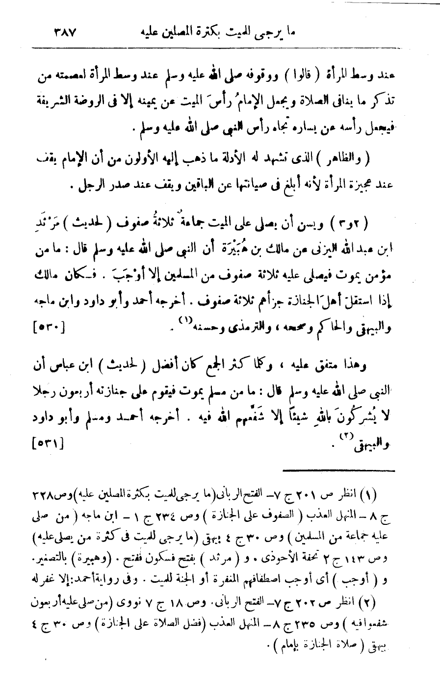 (¬2) انظر ص 202 ج 8 - الفتح الربائى. وص 18 ج 7 نووي (من صلى عليه أربعون شفعوا فيه) وص 235 ج 8 - المنهل العذب (فضل الصلاة على الجنازة) وص 30 ج 4