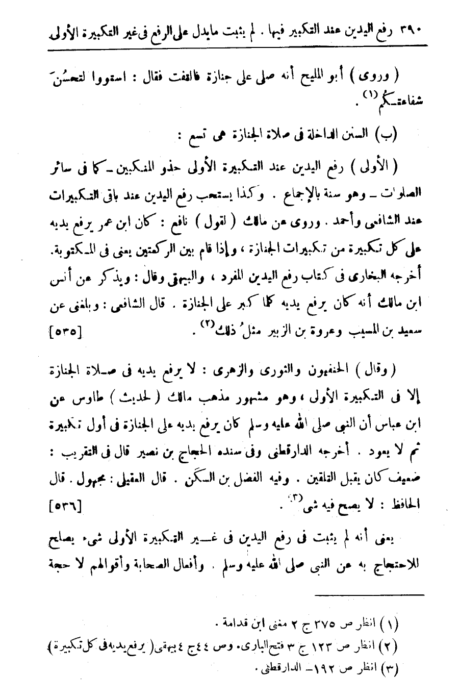 (وقال) الحنفيون والثوري والزهري: لا يرفع يديه في صلاة الجنازة إلا في التكبيرة الأولي، وهو مشهور مذهب مالك (لحديث) طاوس عن ابن عباس أن النبي صلى الله عليه وسلم كان يرفع يديه على الجنازة في أول تكبيرة ثم لا يعود. أخرجه الدار قطبي وفي سنده الحجاج بن نصير بن السكن. قال العقيلى: مجهول. قال الحافظ: لا يصح فيه شئ (¬3) {536}