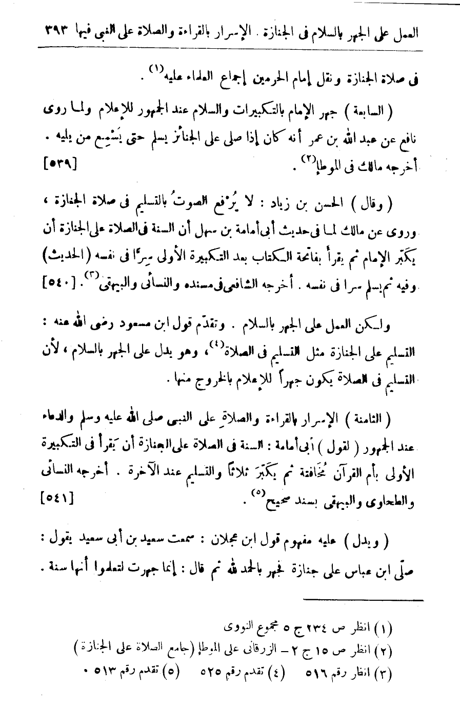 (السابعة) جهر الإمام بالتكبيرات والسلام عند الجمهور للإمام ولما روى نافع عن عبد الله بن عمر انه كان إذا صلى على الجنائز يسلم حتى يسمع من يليه. أخرجه مالك في الموطا (¬2) {539}