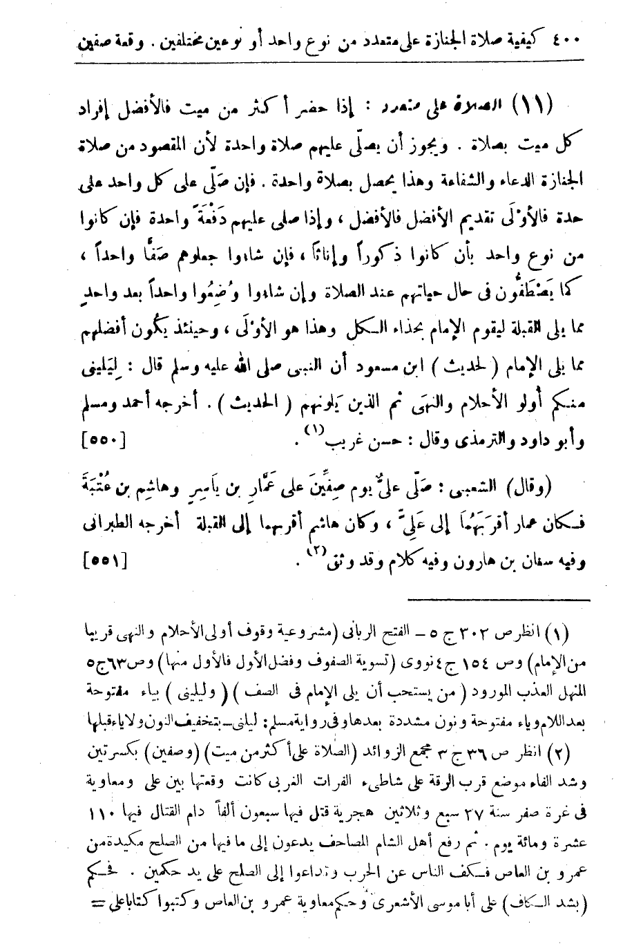 (¬2) انظر ص 36 ج 3 مجمع الزوائد (الصلاة على اكثر من ميت) (وصفين) بكسرتين وشد الفاء موضع قرب الرقه على الشاطئ القرات الغربى كانت وقعتها بين كل ومعاوية في غرة صفر سنة 27 سبع وثلاثين هجرية قتل فيها سبعون الفا دام القتال فيها 110 عشرة ومائة يوم. ثم رفع اهل الشام المصاحف يدعون الى ما فيها من الصلح مكيدة من عمرو بن العاص فكسف الناس عن الحرب. وتدعوا الى الصلح على يد حكمين .. فحكم (بشد الكاف) على ابا موسى الاشعرى وحكم معاوية عمرو بن العاص وكتبوا كتابا على =