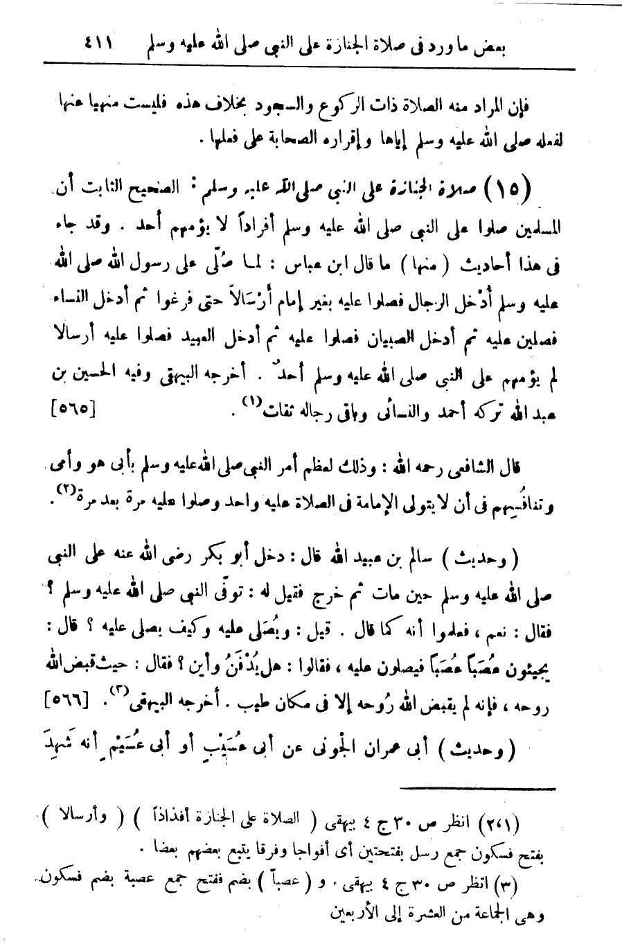 (15) صلاة الجنازة على النبي صلى الله عليه وسلم: الصحيح الثابت أن المسلمين صلوا على النبي صلى الله عليه وسلم افرادا لا يؤمهم أحد. وقد جاء فى هذا أحاديث (منها) ما قال ابن عباس: لما صلى على رسول الله صلى الله علهي وسلم أدخل الرجال فصلوا عليه بغير إمام ارسالا حتى فرغوا ثم أدخل النساء فصلين عليه ثم أدخل الصبيان فصلوا عليه ثم أدخل العميد فصلوا عليه ارسالا لم يؤمهم على النبي صلى الله عليه وسلم أحد. أخرجه البيهقى وفيه الحسين بن عبد الله تركه أحمد والنسائى وباقى رجاله ثقات (¬1). {565}