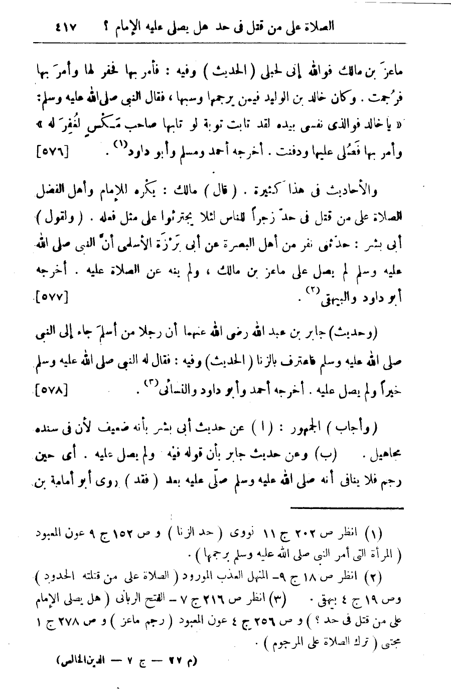 (¬3) انظر ص 216 ج 7 - الفتح الربانى (هل يصلى الإمام على من قتل فى حد؟ ) وص 256 ج 4 عون المعبود (رجم ماعز) وص 278 ج 1 مجتبى (ترك الصلاة على المرجوم).