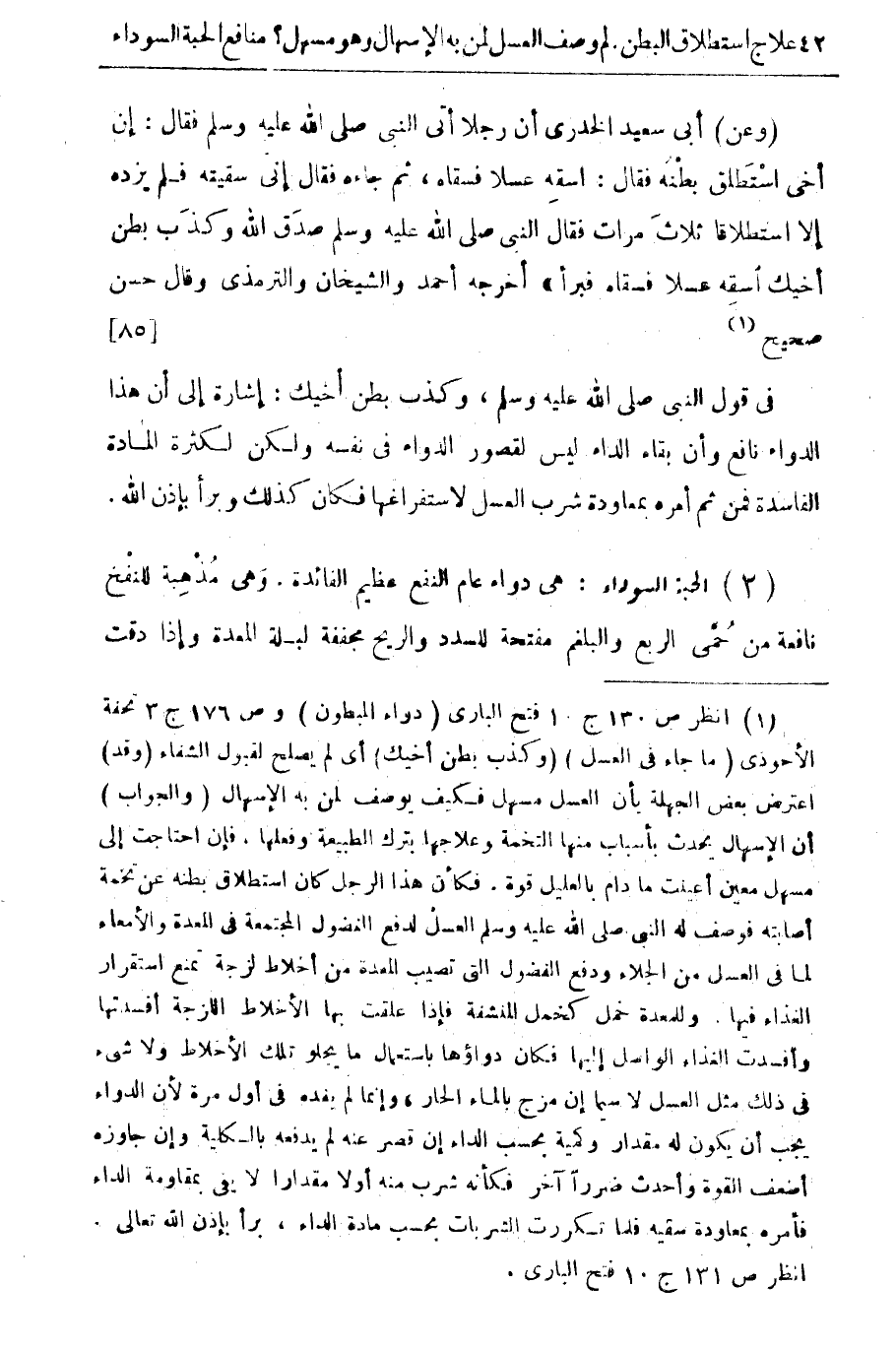 (وعن) أبى سعيد الخدرى أن رجلا أتى النبي صلى الله عليه وسلم فقال: إن أخي استطلق بطنه فقال: اسقه عسلا فسقاه، ثم جاءه فقال أنى سقيته فلم يرده إلا استطلاقا ثلاث مرات فقال النبي صلى الله عليه وسلم صدق الله وكذب بطن أخيك اسقه عسلا فسقاه فبرا " أخرجه أحمد والشيخان والترمذى وقال حسن صحيح (¬1) {