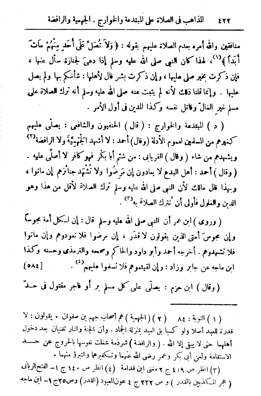 (وروى) ابن عمر أن النبي صلى الله عليه وسلم قال: إن لكل أمة مجوسا وإن مجوس أمتي الذين يقولون لا قدر، إن مرضوا فلا تعودوهم وإن ماتوا فلا تشهدوهم. أخرجه أحمد وأبو داود والحاكم وصححه والترمذى وحسنه وكذا ابن ماجة عن جابر وزاد: وإن لقيتموهم فلا تسلموا عليهم (¬4).