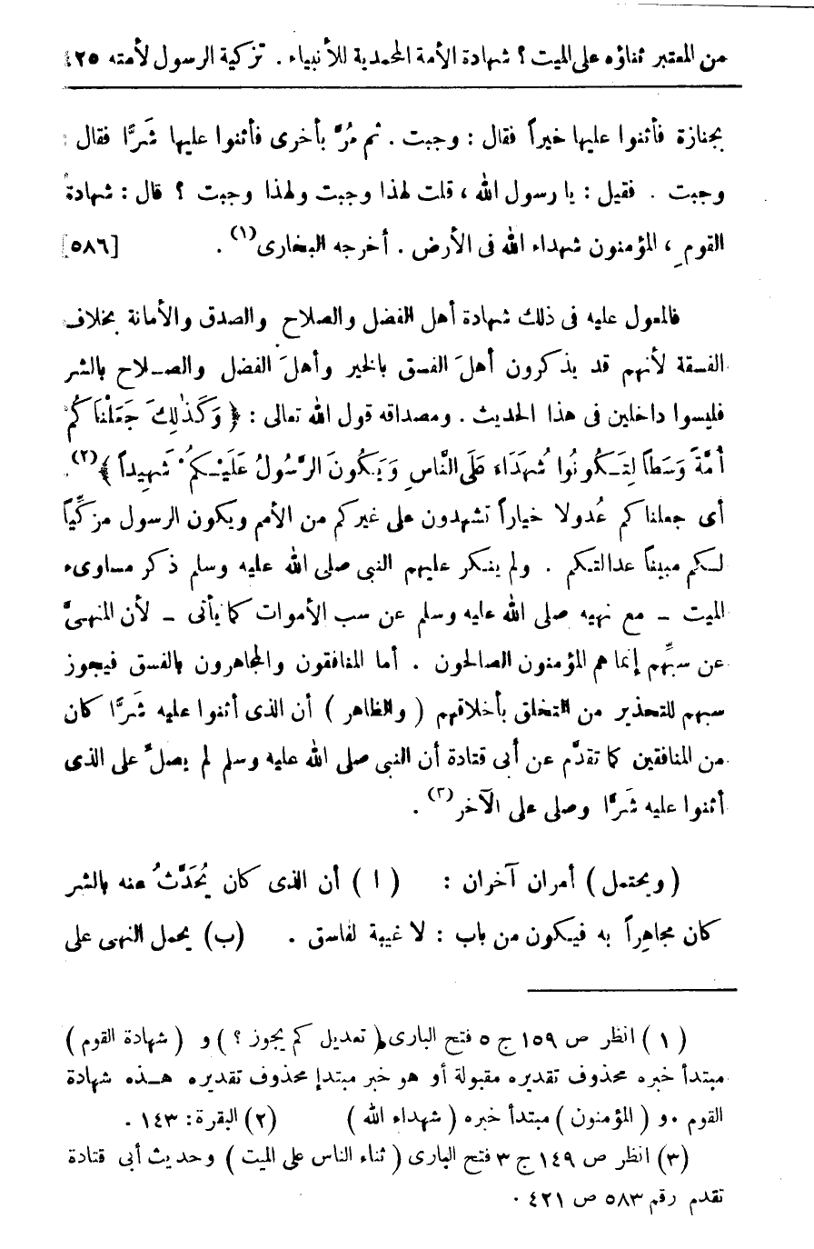 بجنازة فأثنوا عليها خيرا فقال: وجبت. ثم مر بأخرى فاثنوا عليها شرا فقال وجبت. فقيل: يا رسول الله، قلت لهذا وجبت ولهذا وجبت؟ قال: شهادة القوم، المؤمنون شهداء الله في الأرض. أخرجه البخاري (¬1). {586}