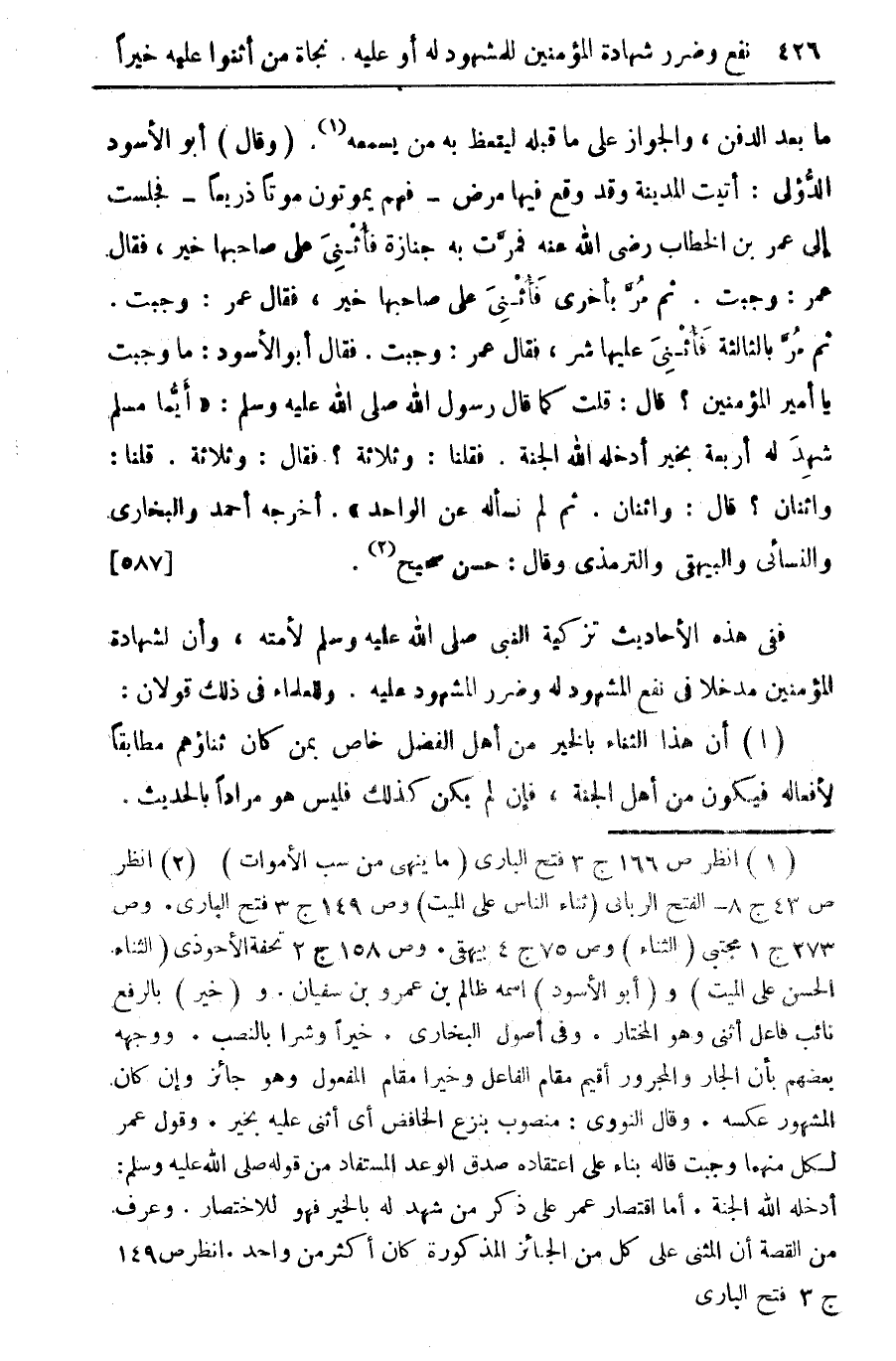 ما بعد الدفن، والجواز على ما قبله ليتعظ به من يسمعه (¬1). (وقال) أبو السود الدولي: أتيت المدينة وقد وقع فيها مرض - فهم يموتون موتا ذريعا - فجلست إلى عمر بن الخطاب رضى الله عنه فمرت به جنازة فاثنى على صاحبها خير، فقال عمر: وجبت. ثم مر بأخرى فأثنى على صاحبها خير، فقال عمر: وجبت ثم مر بالثالثة فأثني عليها شر، فقال عمر: وجبت. فقال أبو الأسود: ما وجبت يا أمير المؤمنين؟ قال: قلت كما قال رسول الله صلى الله عليه وسلم: " أيما مسلم شهد له أربعة بخير أدخله الله الجنة. فقلنا: وثلاثة؟ فقال: وثلاثة. قلنا: واثنان؟ قال: واثنان. ثم لم نسأله عن الواحد ". أخرجه أحمد والبخاري والنسائي والبيهقى والترمذى وقال: حسن صحيح (¬2). {587}