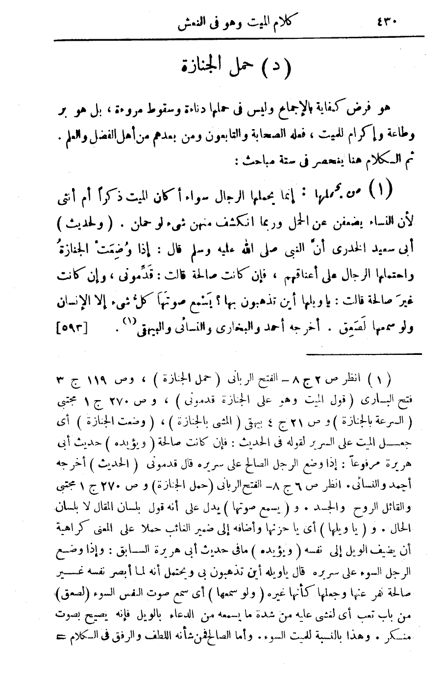(1) من يحملها: إنما يحملها الرجال سواء أكان الميت ذكرا أم أنثى لأن النساء يضعفن عن الحمل وربما انكشف منهن شيء لو حملن. (ولحديث) أبي سعيد الخدرى أن النبي صلى الله عليه وسلم قال: إذا وضعت الجنازة واحتملها الرجال على أعناقهم، فإن كانت صالحة قالت: قدموني، وإن كانت غير صالحة قالت: يا ويلها أين تذهبون بها؟ يسمع صوتها كل شيء إلا الإنسان ولو سمعها لصعق. أخرجه أحمد والبخاري والنسائي والبيهقى (¬1). [593]