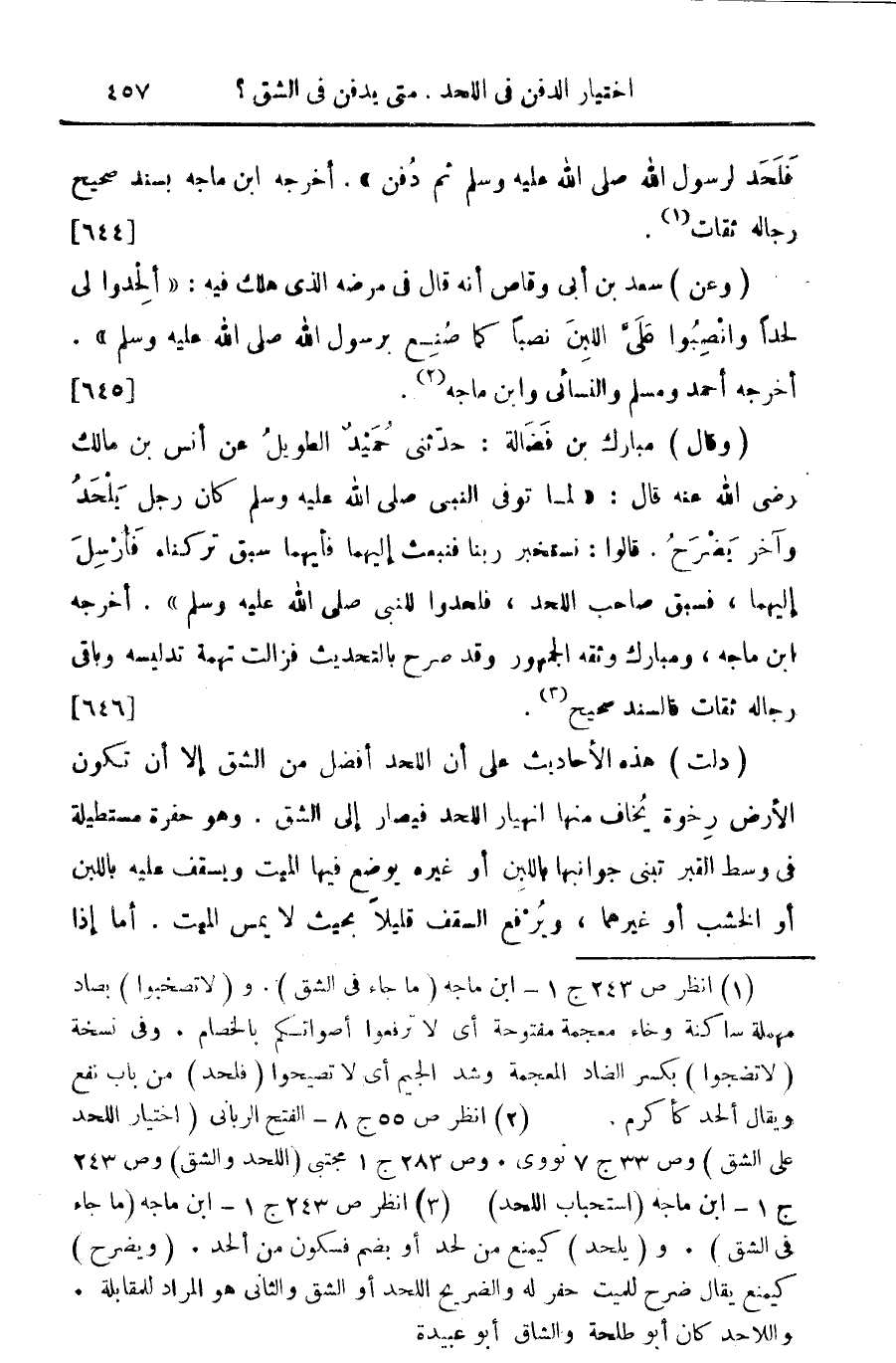 (¬2) انظر ص 55 ج 8 - الفتح الربانى (اختيار اللحد على الشق) وص 33 ج 7 نووى. وص 283 ج 1 مجتبى (اللحد والشق) وص 243 ج 1 - ابن ماجه (استحباب اللحد).