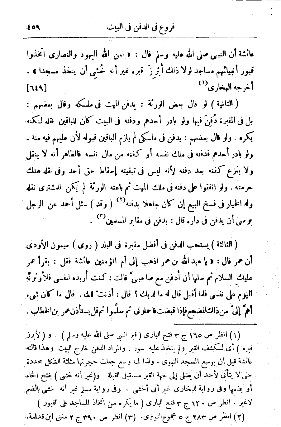 عائشة أن النبي صلى الله عليه وسلم قال: " لعن الله اليهود والنصارى اتخذوا قبور أنبيائهم مساجد لولا ذلك أبرز قبره غير أنه خشي أن يتخذ مسجدا " أخرجه البخاري (¬1). {649}